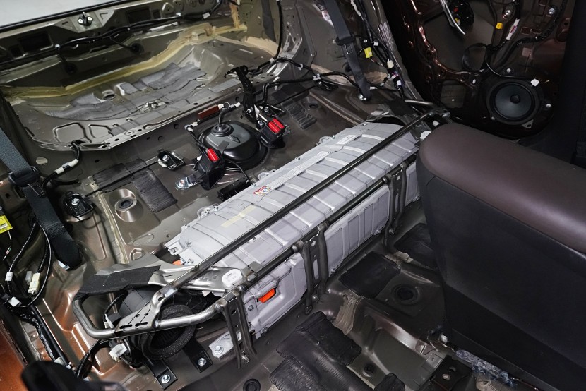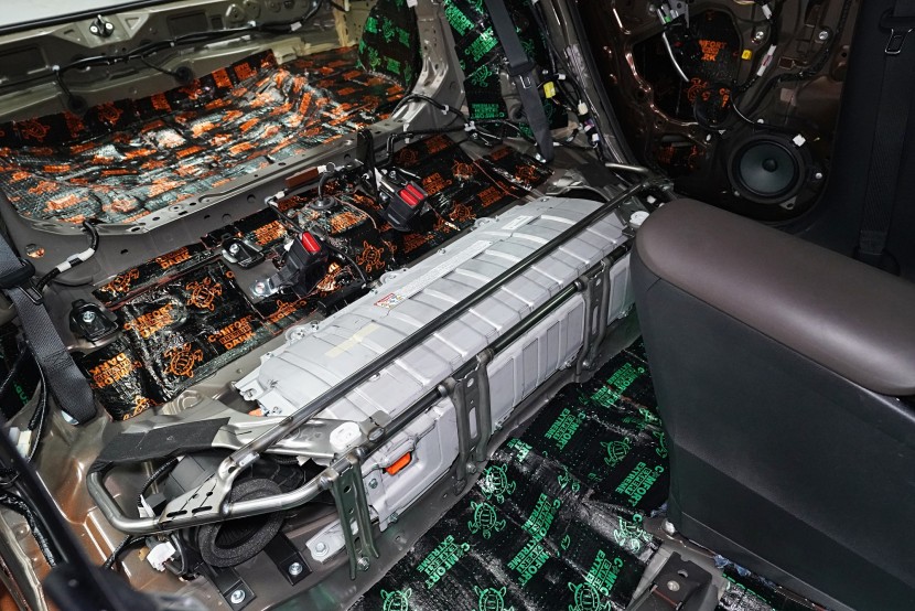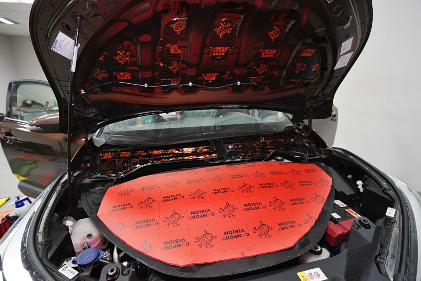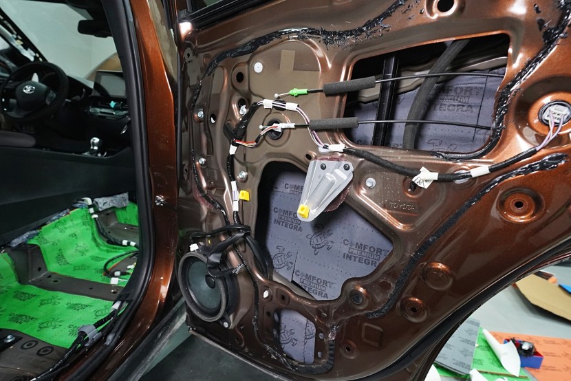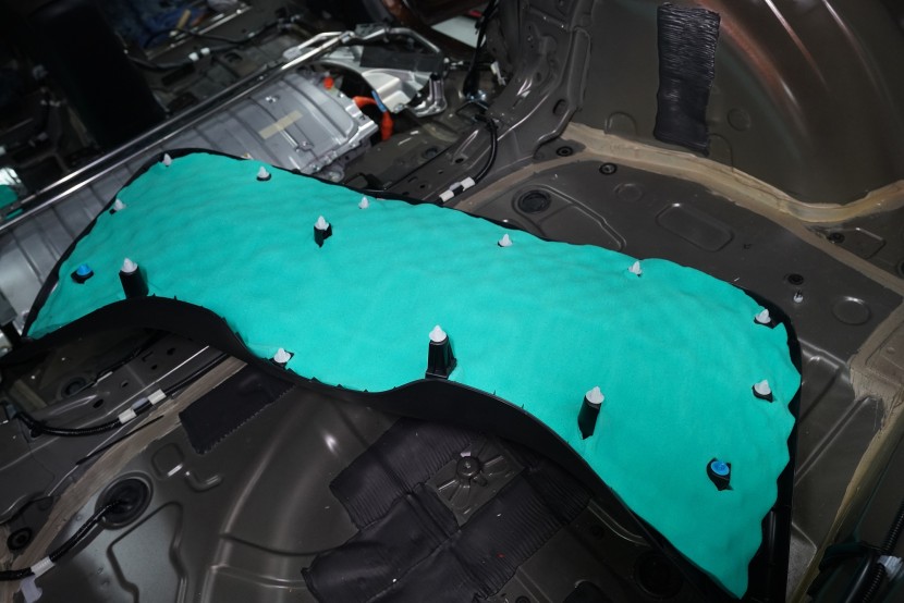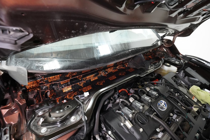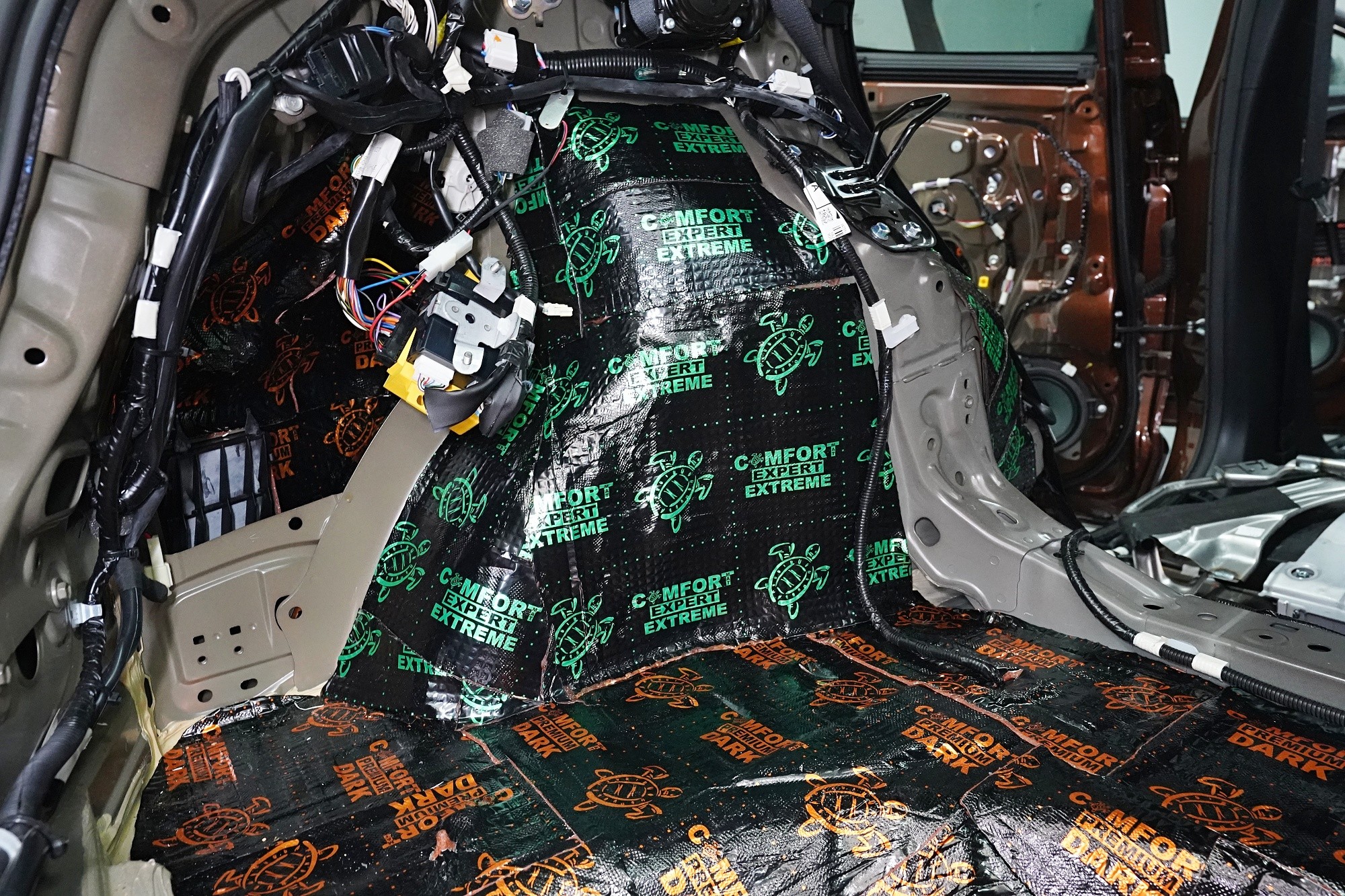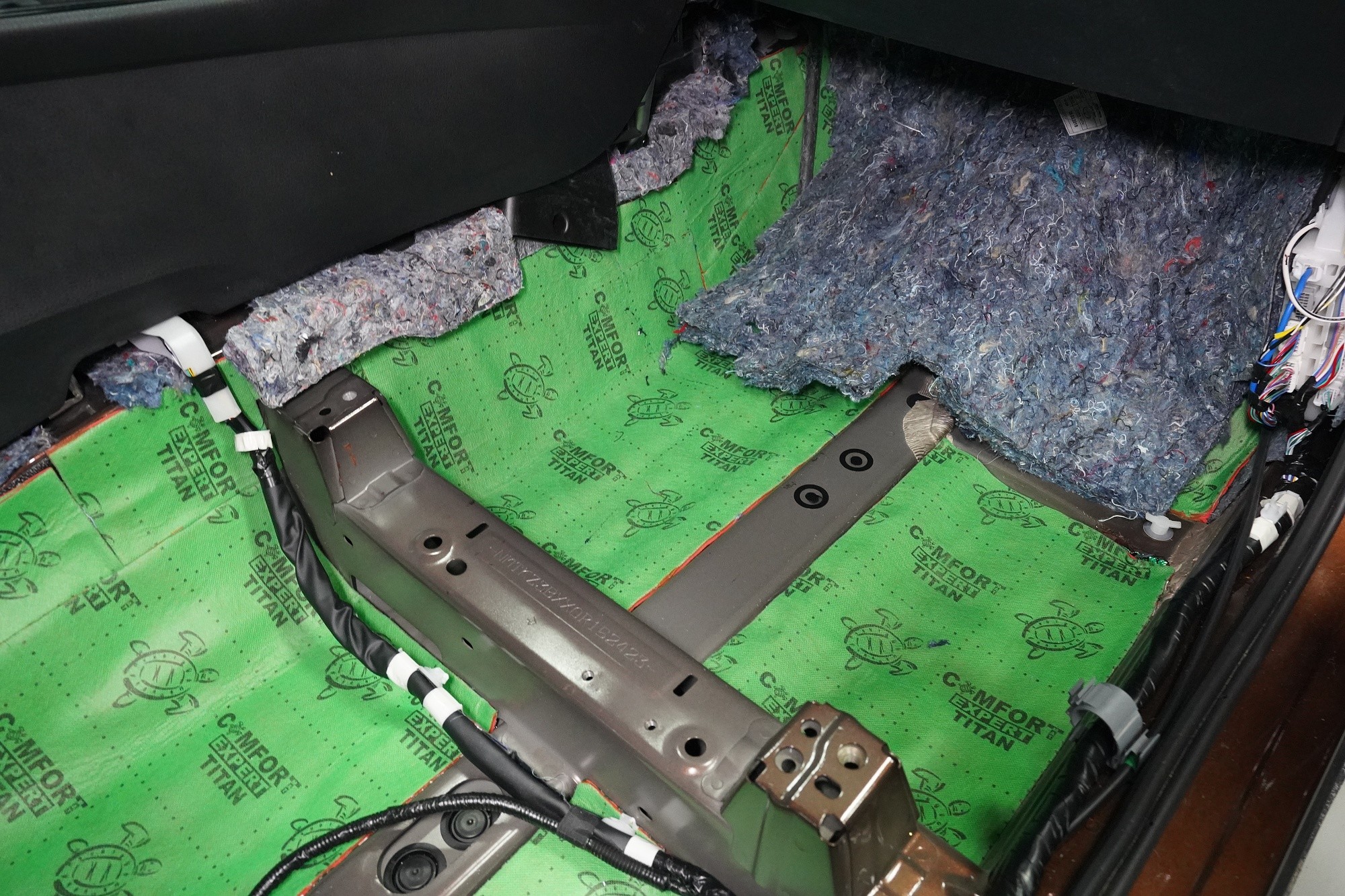 Toyota CHR Hybrid и нашата шумоизолация в рамките на най-ефективния пакет Expert Plus. Практически липсващата звукова изолация се проявява чрез силен шум от гумите, вода и камъчета в калниците, шум от вятъра при високи скорости, както и скърцане на пластмасите. Всичко това намалява комфорта при шофиране на този автомобил и затова собственикът се обърна към нас. След нашата шумоизолация изчезват вибрациите от двигателя, трансмисията или окачването, както и въздушно-преносимият шум на различни честоти от областта на пода, предните и задните калници и разбира се от вратите и задната част на автомобила. Съвместно със собственика се договорихме за нашия най-ефективен пакет шумоизолация Expert Plus. В сравнение с класическия пакет Expert избираме по-ефективни и по-дебели материали и повече слоеве с фокус най-вече върху пода и задните калници на автомобила. Конкретно шумоизолираме предните, задните и петите врати, пода, багажното пространство, покрива, предните и задните калници от вътрешната страна, таблото и капака на двигателя. Всички важни области на автомобила са шумоизолирани с модерни двуслойни материали и в резултат са приложени четири слоя шумоизолация с различни свойства. За шумоизолацията едновременно работят четирима наши техници, които извършват монтажа в рамките на 1 работен ден.