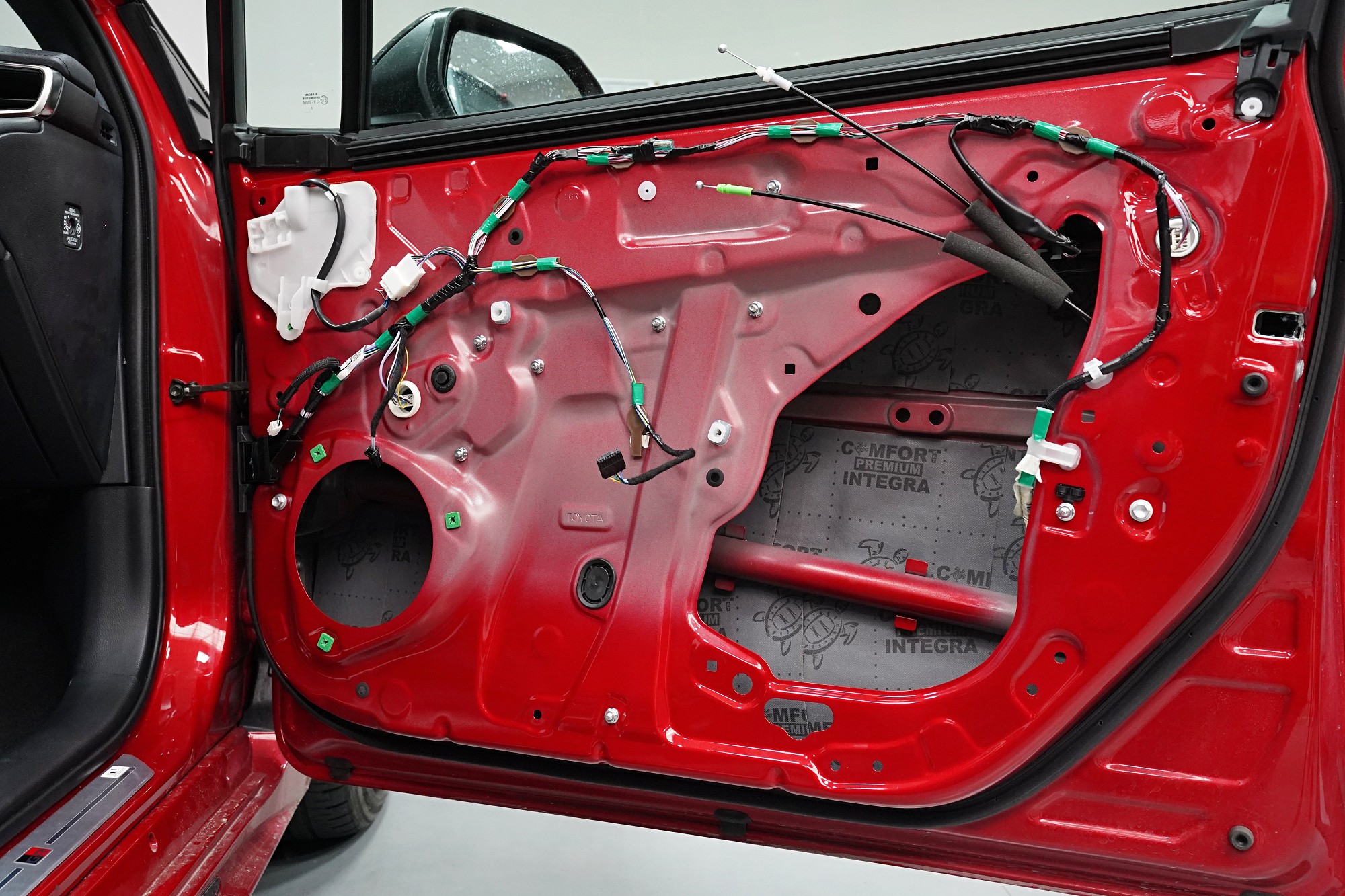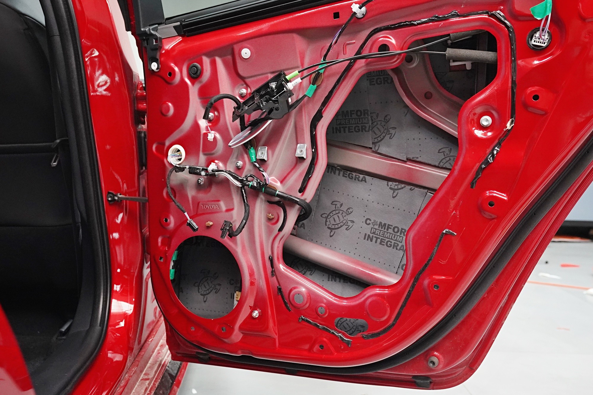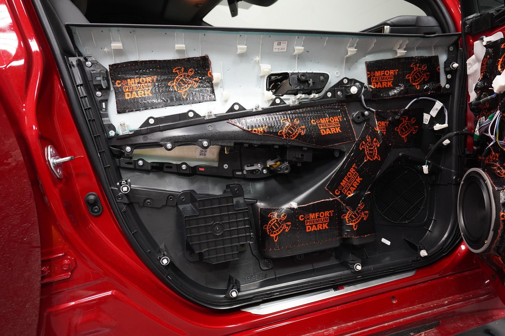 Шумоизолация на Toyota Corolla от последното поколение. Вече дванадесето издание на този изключително успешен модел и, според нашите очаквания, фабричната звукова изолация не се е променила. Практически нулевата звукоизолация се проявява с явен шум от гумите, вода и камъчета в арките, вятърен шум при високи скорости, както и скърцане на пластмасите в резултат на по-твърдо окачване. Всичко това намалява комфорта при шофиране и затова собственикът се обърна към нас. След нашата шумоизолация ще изчезнат вибрациите от двигателя, скоростната кутия или окачването, както и въздушният шум с различни честоти от зоната на пода, предните и задните арки и разбира се от вратите и задната част на автомобила. С клиента се договорихме за нашия подобрен пакет шумоизолация Premium Plus, в който прилагаме висококачествени материали Comfortmat предимно от най-високата серия Expert. Благодарение на това сме в състояние да постигнем намаляване на шума над 4,5 dB при магистрална скорост, което означава повече от 2,5 пъти по-нисък шум в купето в сравнение с преди прилагането на шумоизолацията. Конкретно се фокусирахме върху предните, задните и петите врати, полето, багажника, предните и задните арки от страната на автомобила и капака. Автомобилът беше и озвучен. Подменихме фабричните говорители с акустично напреднали компоненти на италианския производител Audison, които свързахме към четириканален усилвател с DSP процесор от същия производител. С помощта на калибриран микрофон измерихме всички недостатъци и препятствия на автомобила и прецизно настроихме пространствената корекция на еквалайзера за всеки говорител в автомобила. След това настроихме времевите корекции, нивата, честотните филтри и фазите — всичко това за осигуряване на максимално вярно звучене. За инсталацията работят едновременно четирима наши техници, които успяват монтажа с малък извънреден труд в рамките на 1 работен ден. Ако се интересувате само от шумоизолация, цената беше 32 896 Kč и работата отне 26 часа. Всички важни информации ще намерите в нашия обширен фоторепортаж.