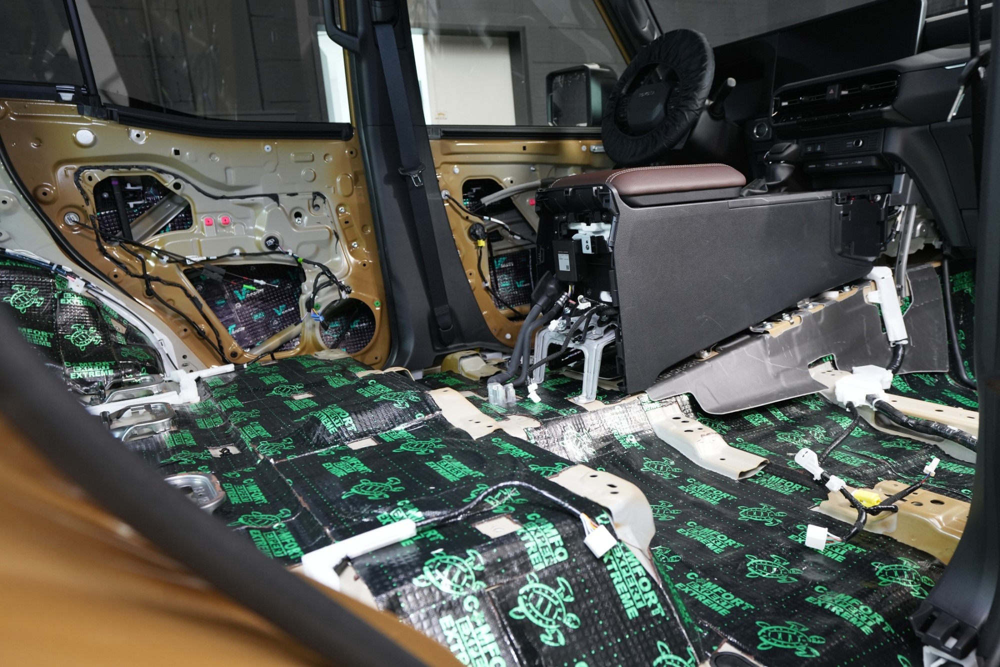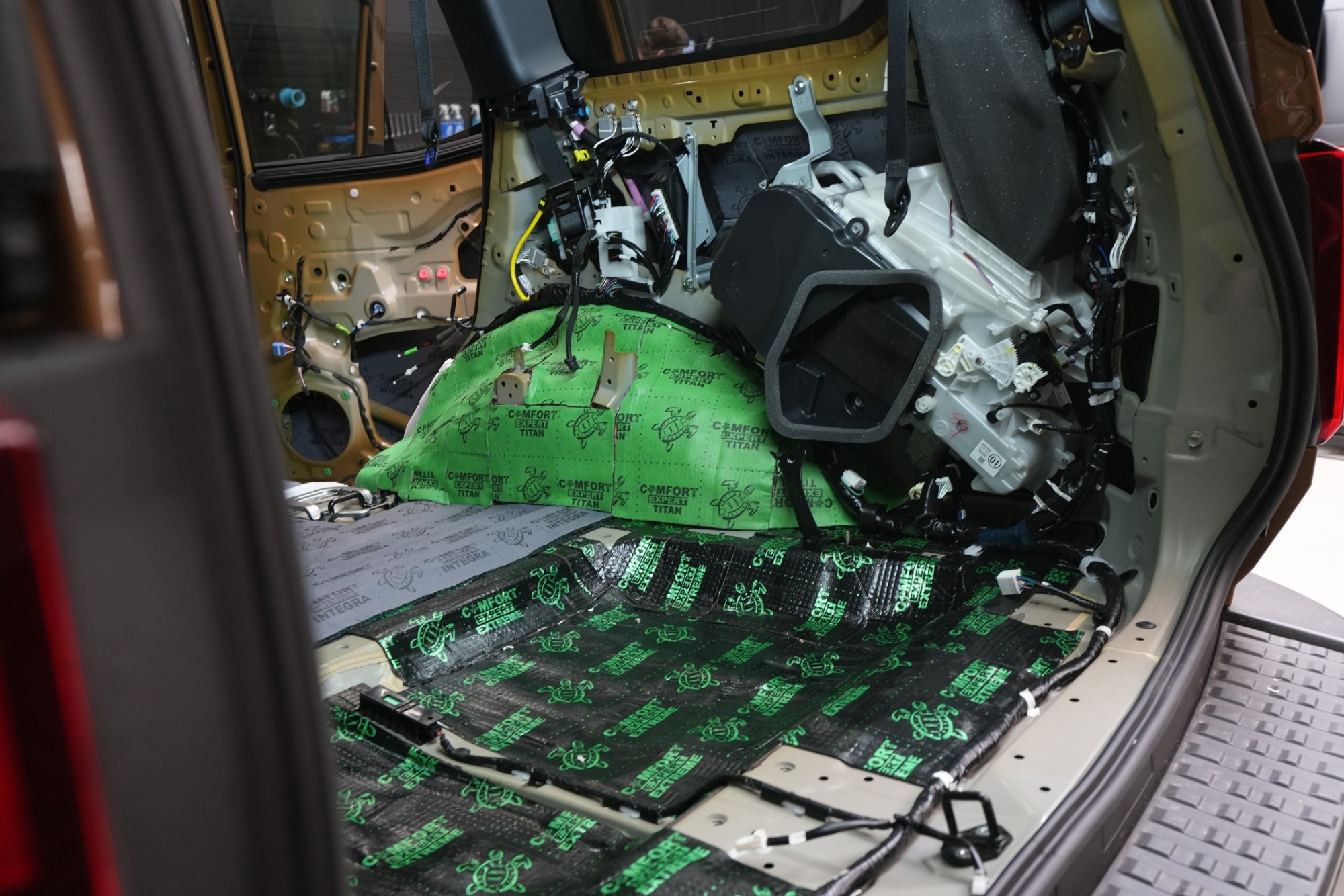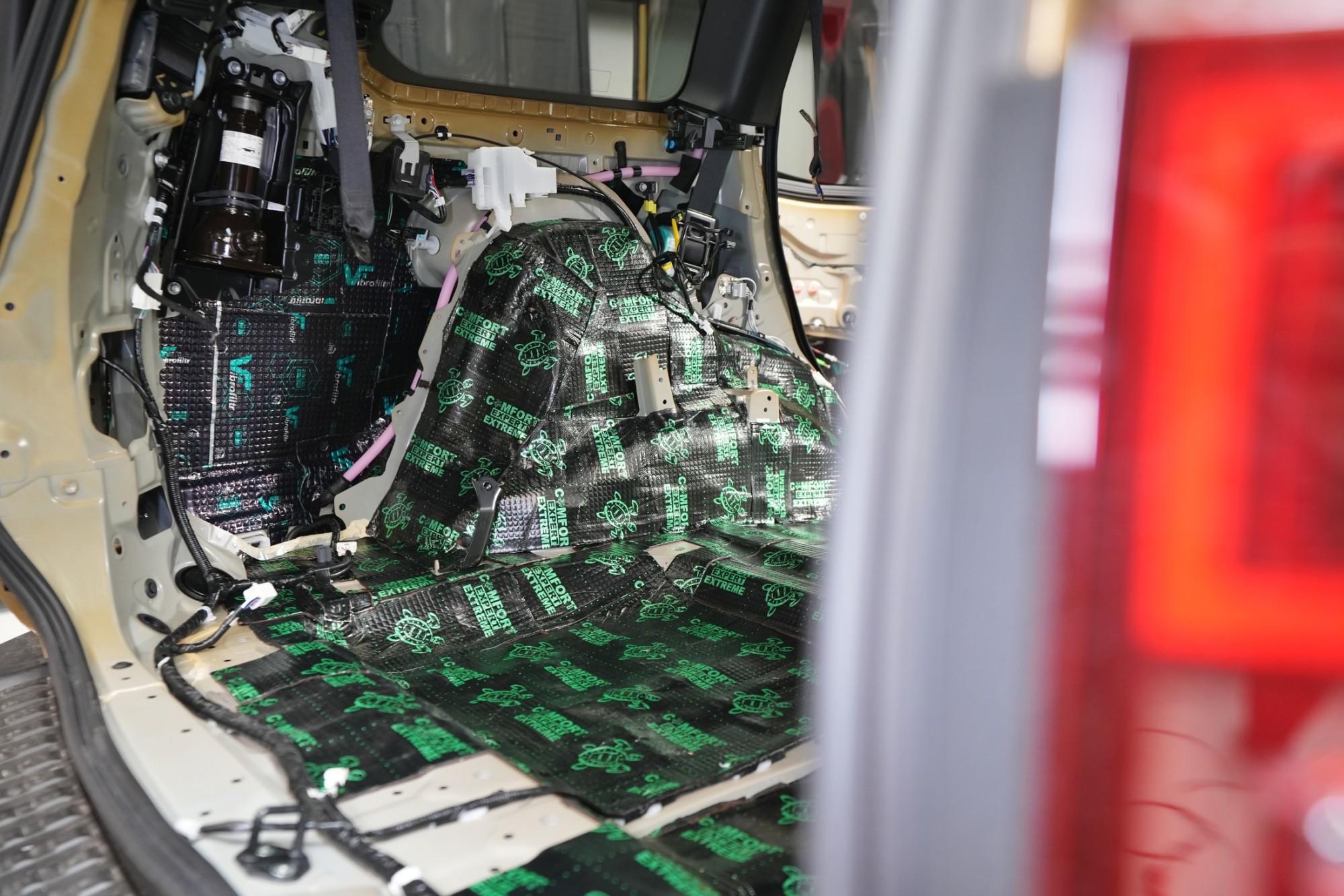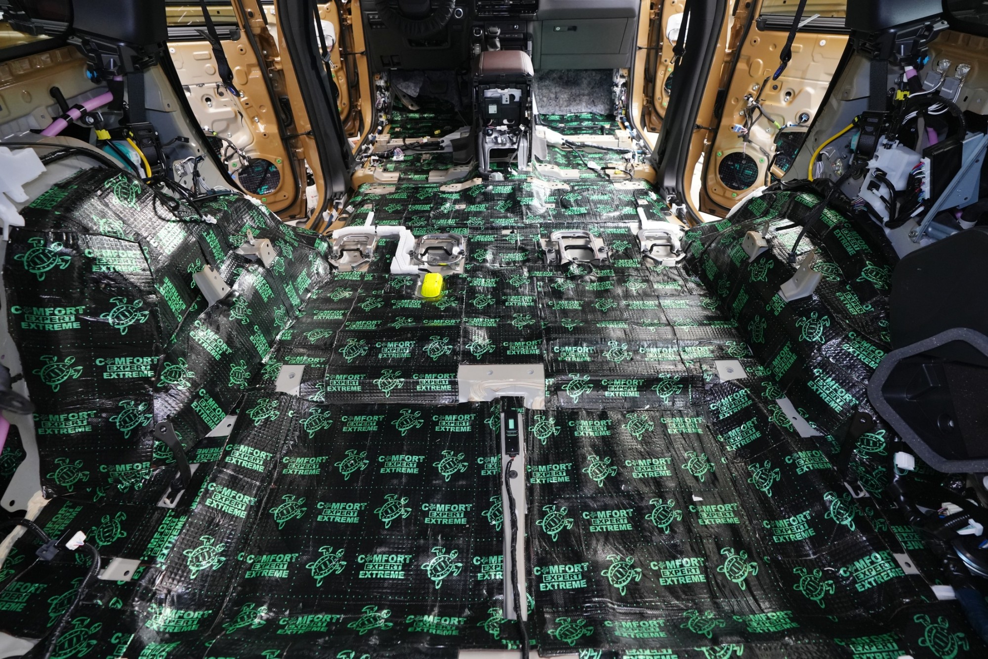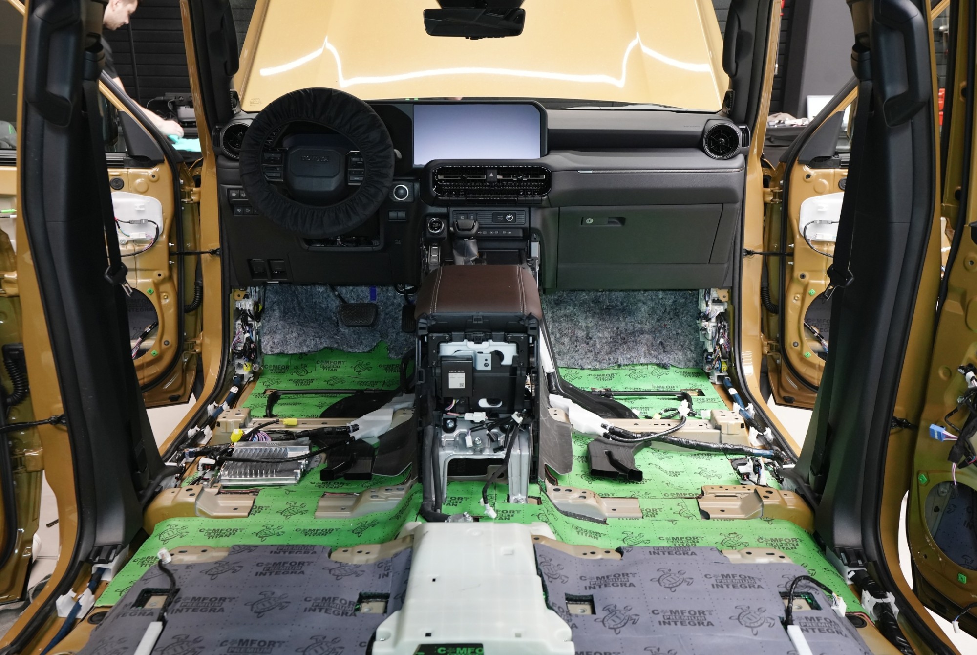 Шумоизолация на автомобил Toyota Land Cruiser. Този почти легендарен офроуд автомобил с повече от 70-годишна традиция спечели популярност благодарение на своята здравина, надеждност и способност да се справя дори с най-тежките условия. Поколението с означение 250 премина през значителна модернизация спрямо предшественика си, водено от подобрен комфорт, по-качествени материали и модерни технологии. В сервиза ни попадна лимитирана серия, която с кръглите си фарове допълнително допринася за привлекателния ретро дизайн. Що се отнася до шумоизолацията, както при много офроуд превозни средства, шумът от гумите и ходовата част е проблем. Нашият пакет шумоизолация Premium Plus е насочен към тези области и минимизира проникването на шум в купето. Конкретно шумоизолираме всички врати, пода, предни и задни подкалници, таблото и капака. Всички важни зони на автомобила ще бъдат шумоизолирани с модерни двуслойни материали с увеличена дебелина и ефективност. По шумоизолацията работят едновременно четирима наши техници, които благодарение на дългогодишния си опит могат да извършат монтажа в рамките на 1 работен ден. Резултатът е значително по-висок акустичен комфорт и удобство за всички пътници, което допринася за по-приятно изживяване при шофиране както в кратки градски маршрути, така и при офроуд излети.