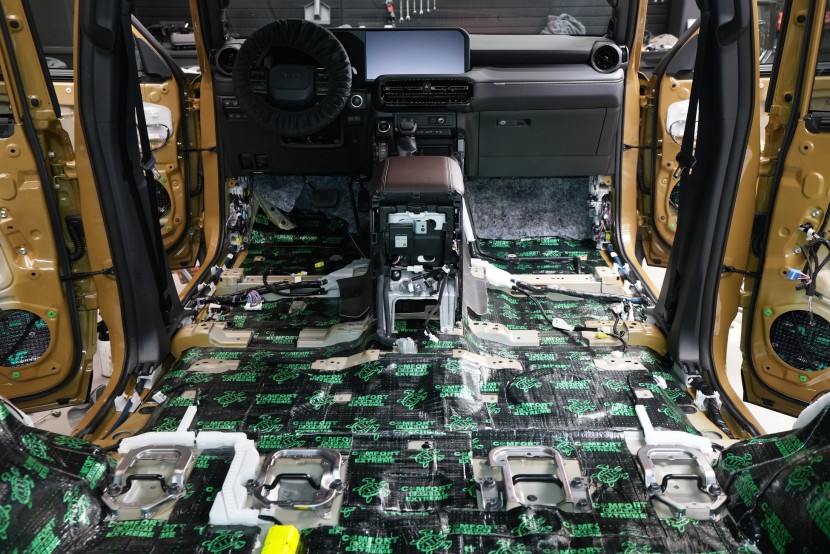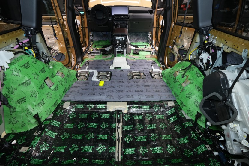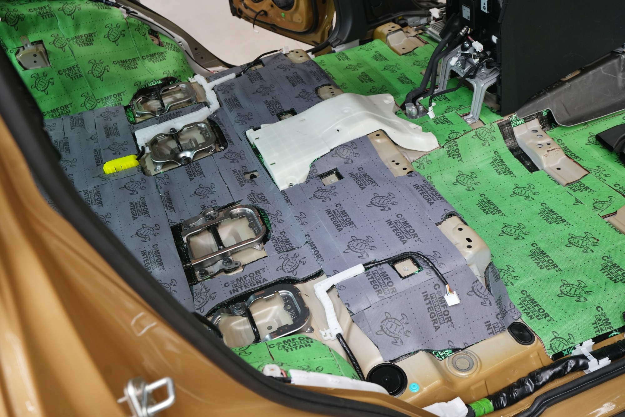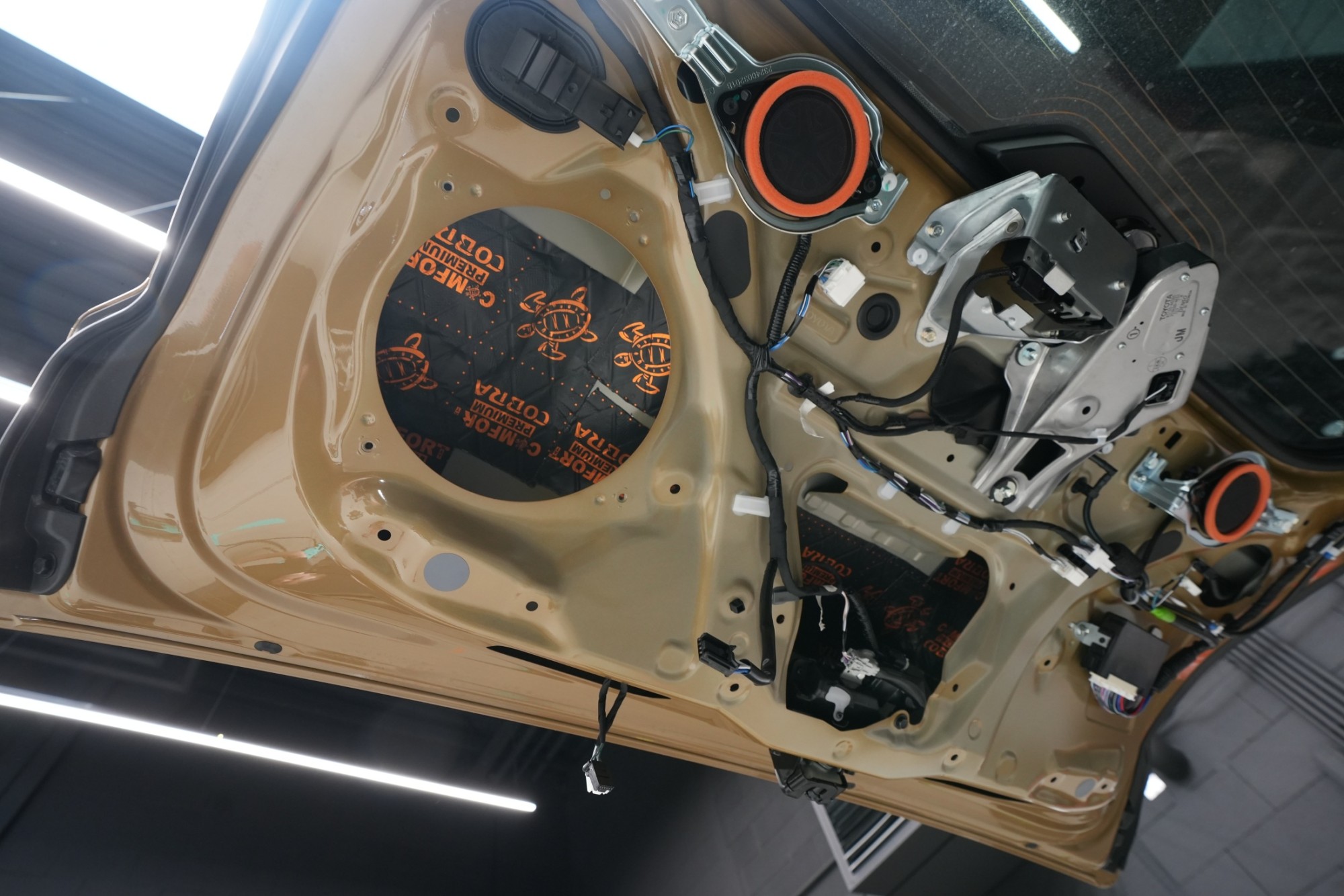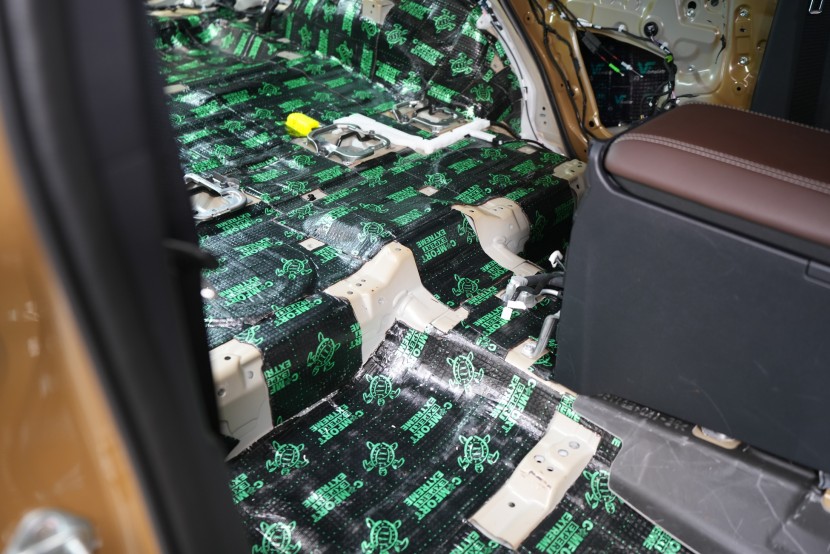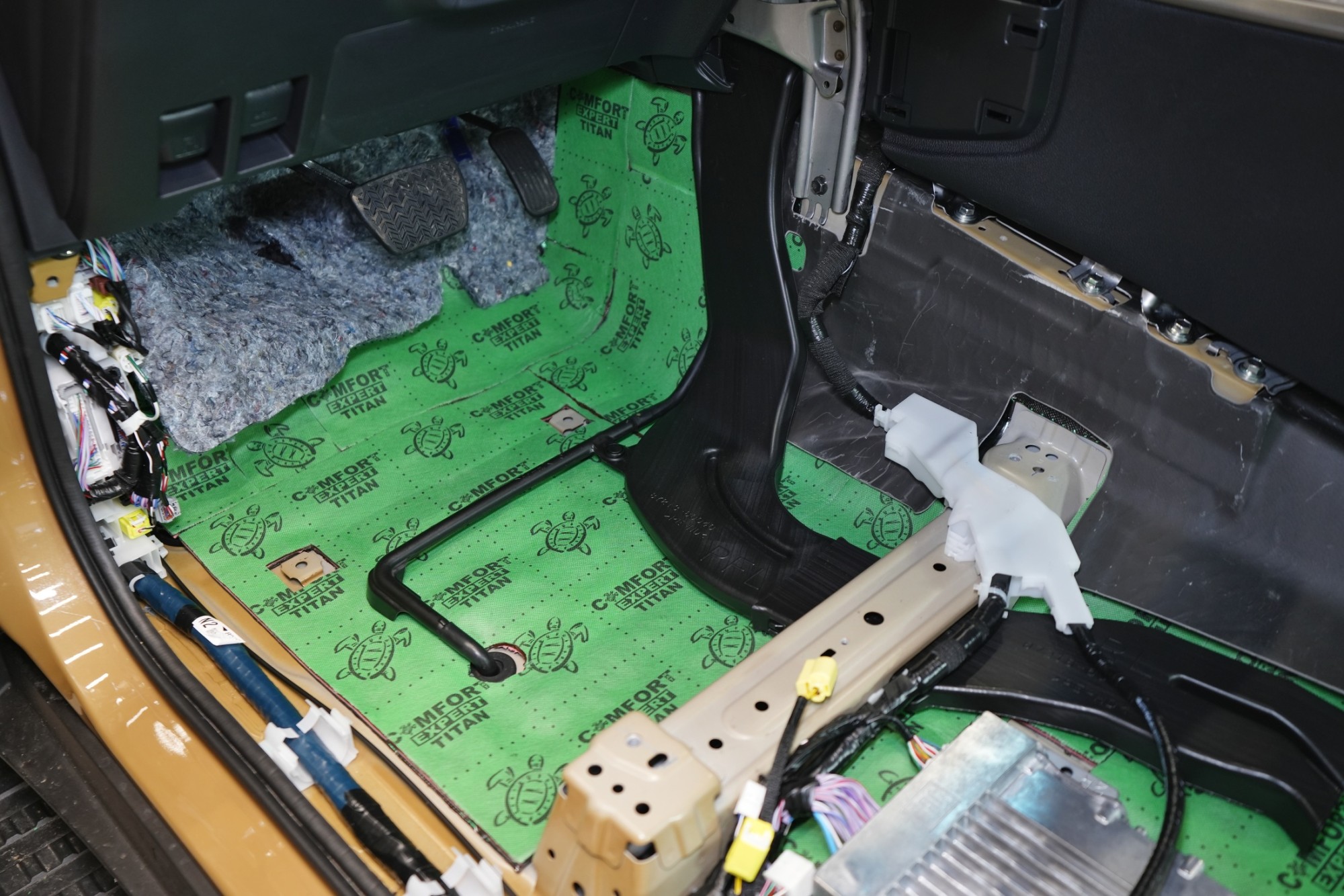 Шумоизолация на автомобил Toyota Land Cruiser. Този почти легендарен офроуд автомобил с повече от 70-годишна традиция спечели популярност благодарение на своята здравина, надеждност и способност да се справя дори с най-тежките условия. Поколението с означение 250 премина през значителна модернизация спрямо предшественика си, водено от подобрен комфорт, по-качествени материали и модерни технологии. В сервиза ни попадна лимитирана серия, която с кръглите си фарове допълнително допринася за привлекателния ретро дизайн. Що се отнася до шумоизолацията, както при много офроуд превозни средства, шумът от гумите и ходовата част е проблем. Нашият пакет шумоизолация Premium Plus е насочен към тези области и минимизира проникването на шум в купето. Конкретно шумоизолираме всички врати, пода, предни и задни подкалници, таблото и капака. Всички важни зони на автомобила ще бъдат шумоизолирани с модерни двуслойни материали с увеличена дебелина и ефективност. По шумоизолацията работят едновременно четирима наши техници, които благодарение на дългогодишния си опит могат да извършат монтажа в рамките на 1 работен ден. Резултатът е значително по-висок акустичен комфорт и удобство за всички пътници, което допринася за по-приятно изживяване при шофиране както в кратки градски маршрути, така и при офроуд излети.