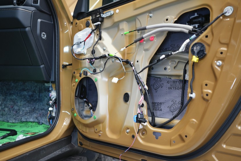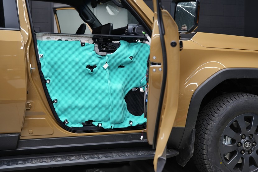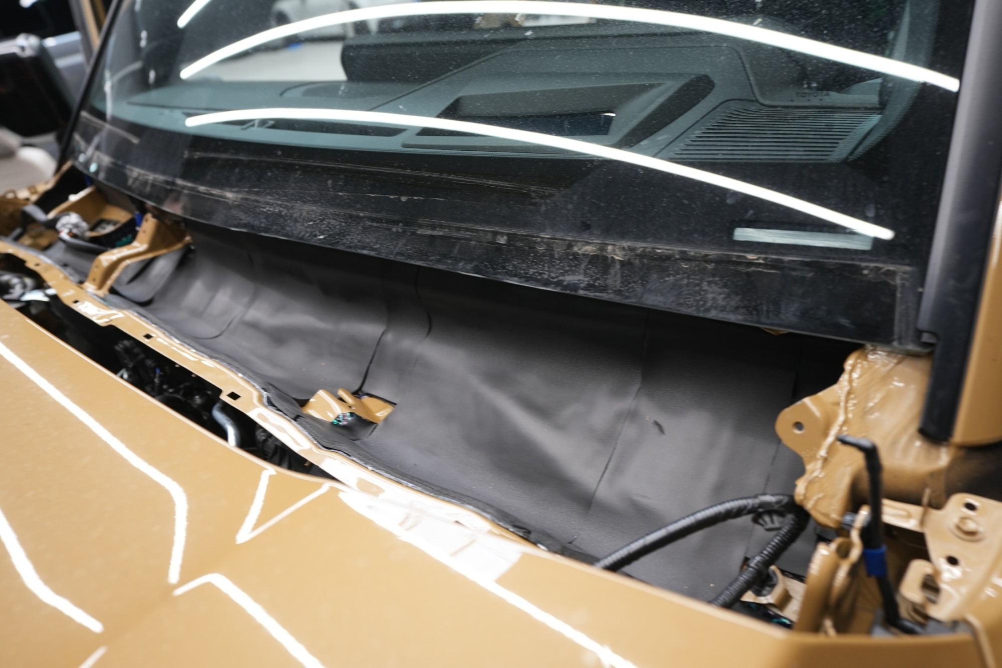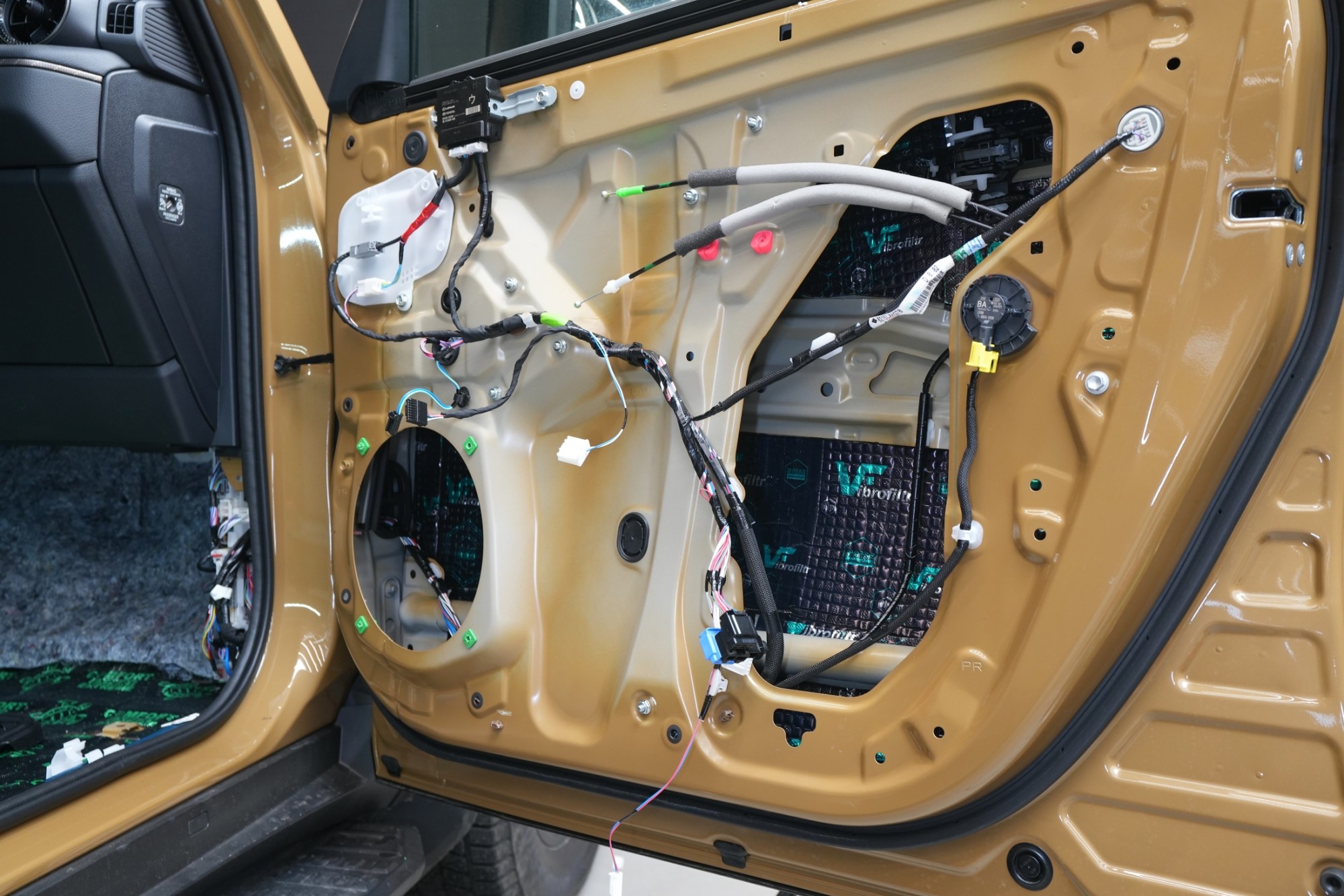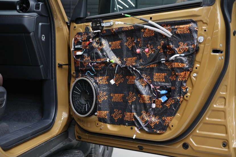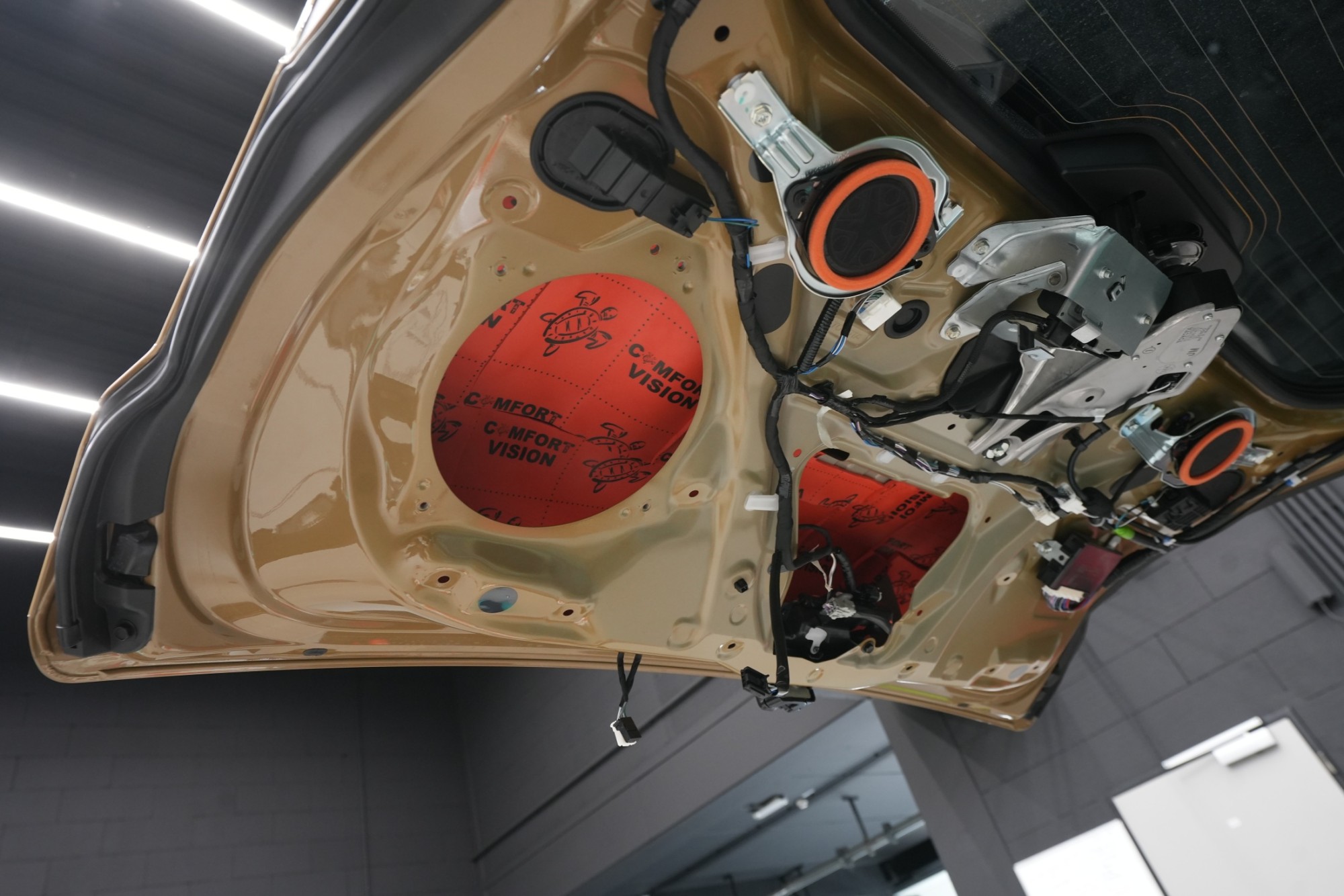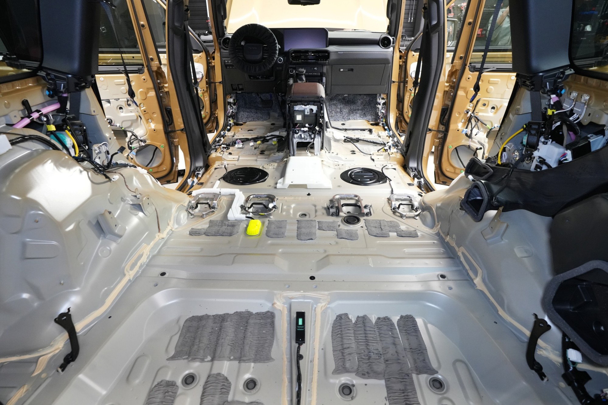 Шумоизолация на автомобил Toyota Land Cruiser. Този почти легендарен офроуд автомобил с повече от 70-годишна традиция спечели популярност благодарение на своята здравина, надеждност и способност да се справя дори с най-тежките условия. Поколението с означение 250 премина през значителна модернизация спрямо предшественика си, водено от подобрен комфорт, по-качествени материали и модерни технологии. В сервиза ни попадна лимитирана серия, която с кръглите си фарове допълнително допринася за привлекателния ретро дизайн. Що се отнася до шумоизолацията, както при много офроуд превозни средства, шумът от гумите и ходовата част е проблем. Нашият пакет шумоизолация Premium Plus е насочен към тези области и минимизира проникването на шум в купето. Конкретно шумоизолираме всички врати, пода, предни и задни подкалници, таблото и капака. Всички важни зони на автомобила ще бъдат шумоизолирани с модерни двуслойни материали с увеличена дебелина и ефективност. По шумоизолацията работят едновременно четирима наши техници, които благодарение на дългогодишния си опит могат да извършат монтажа в рамките на 1 работен ден. Резултатът е значително по-висок акустичен комфорт и удобство за всички пътници, което допринася за по-приятно изживяване при шофиране както в кратки градски маршрути, така и при офроуд излети.