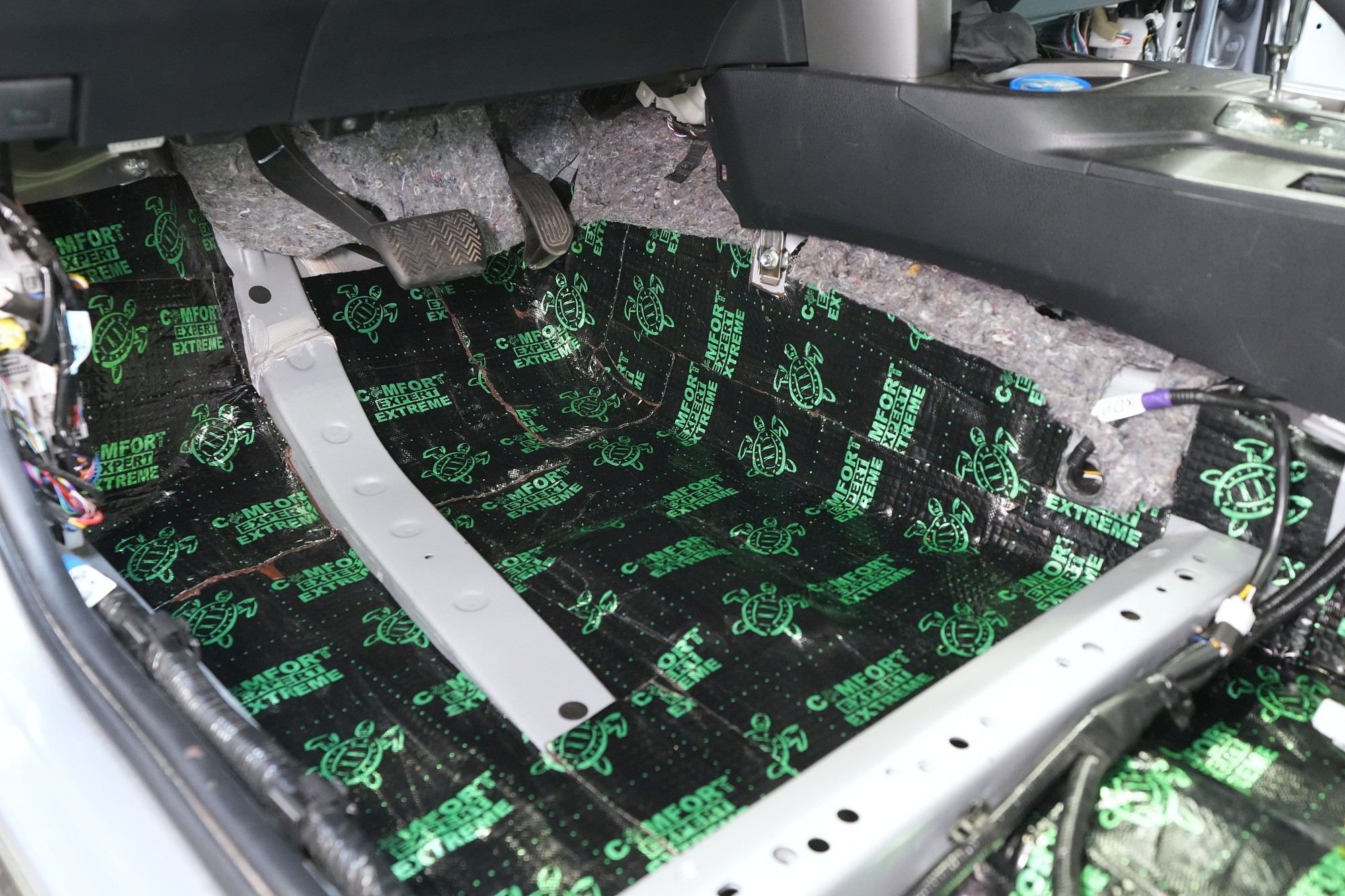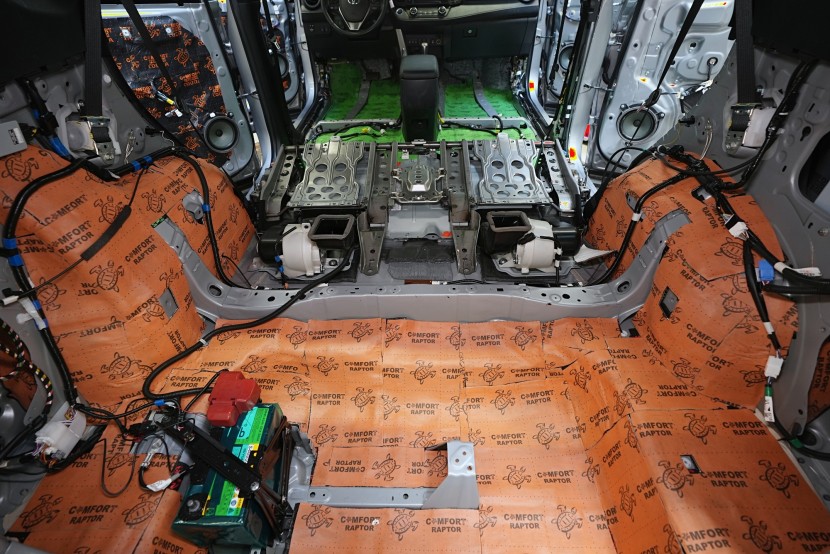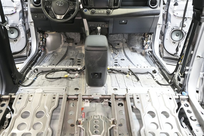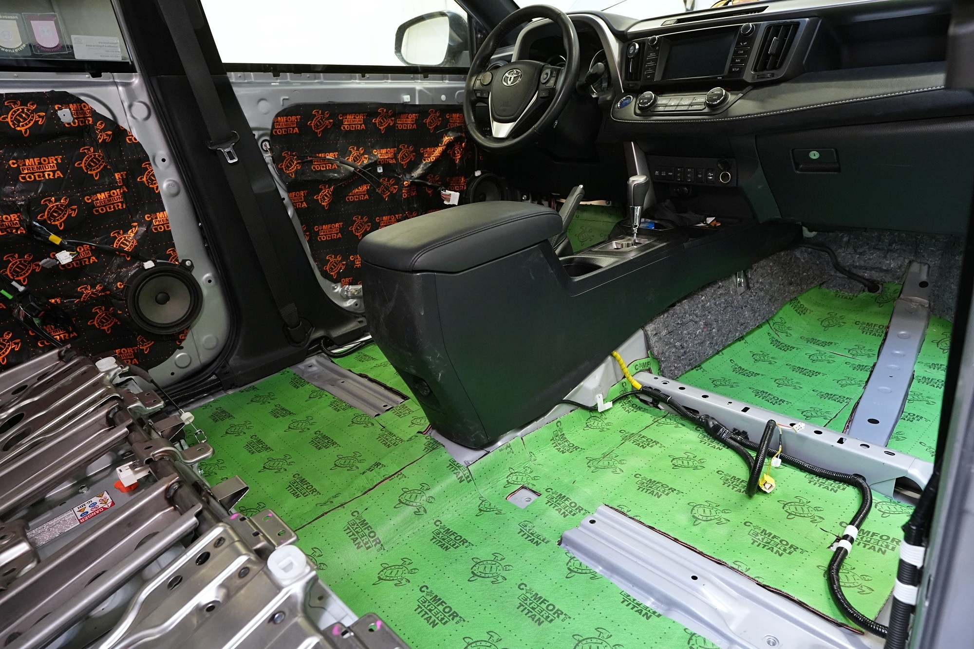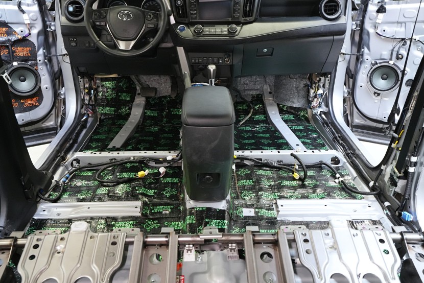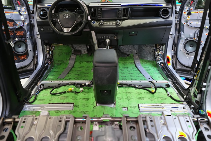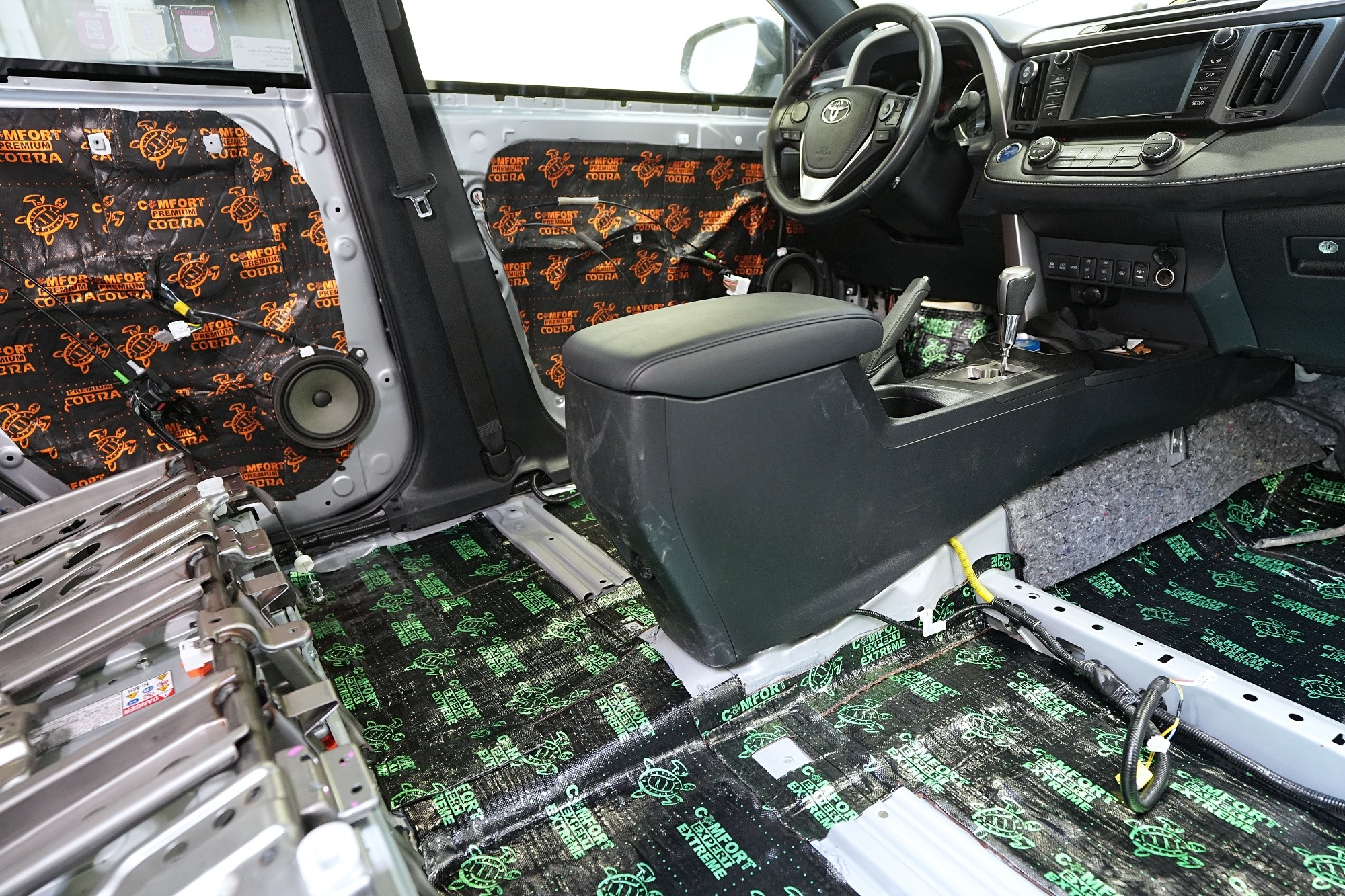 Шумоизолация на Toyota RAV4 най-новото поколение. В сравнение с предишната версия този популярен кросоувър е неузнаваем. Той е пораснал, уплътнен, хвали се с ъгловат дизайн и същевременно се оказа, че автомобилът е по-комфортен благодарение на преконфигурирането на стандартното окачване. Toyota също така подобри звуковата изолация, според което шумът е намален с 30%, особено в областта на вибрациите. Собственикът и наш клиент обаче не е съгласен и тъй като неговият автомобил е нетърпимо шумен, особено при повишаване на скоростта, той се реши на нашия най-ефективен пакет шумоизолация Expert Plus. Затова се фокусирахме върху всички ключови зони на автомобила, използвайки най-ефикасните ни материали Comfortmat от професионалната серия Expert. Те осигуряват предимно по-висока степен на шумоизолация на най-важните области като пода и подкрилките. По-конкретно шумоизолирахме предните, задните и петата врата, пода, багажното отделение, предните и задните подкрилки отвътре, покрива, таблото и предния капак. По монтажа работеха едновременно четирима наши опитни техници, които завършват инсталацията в рамките на 1 работен ден. Повече интересна информация за инсталацията можете да намерите в нашия фоторепортаж.