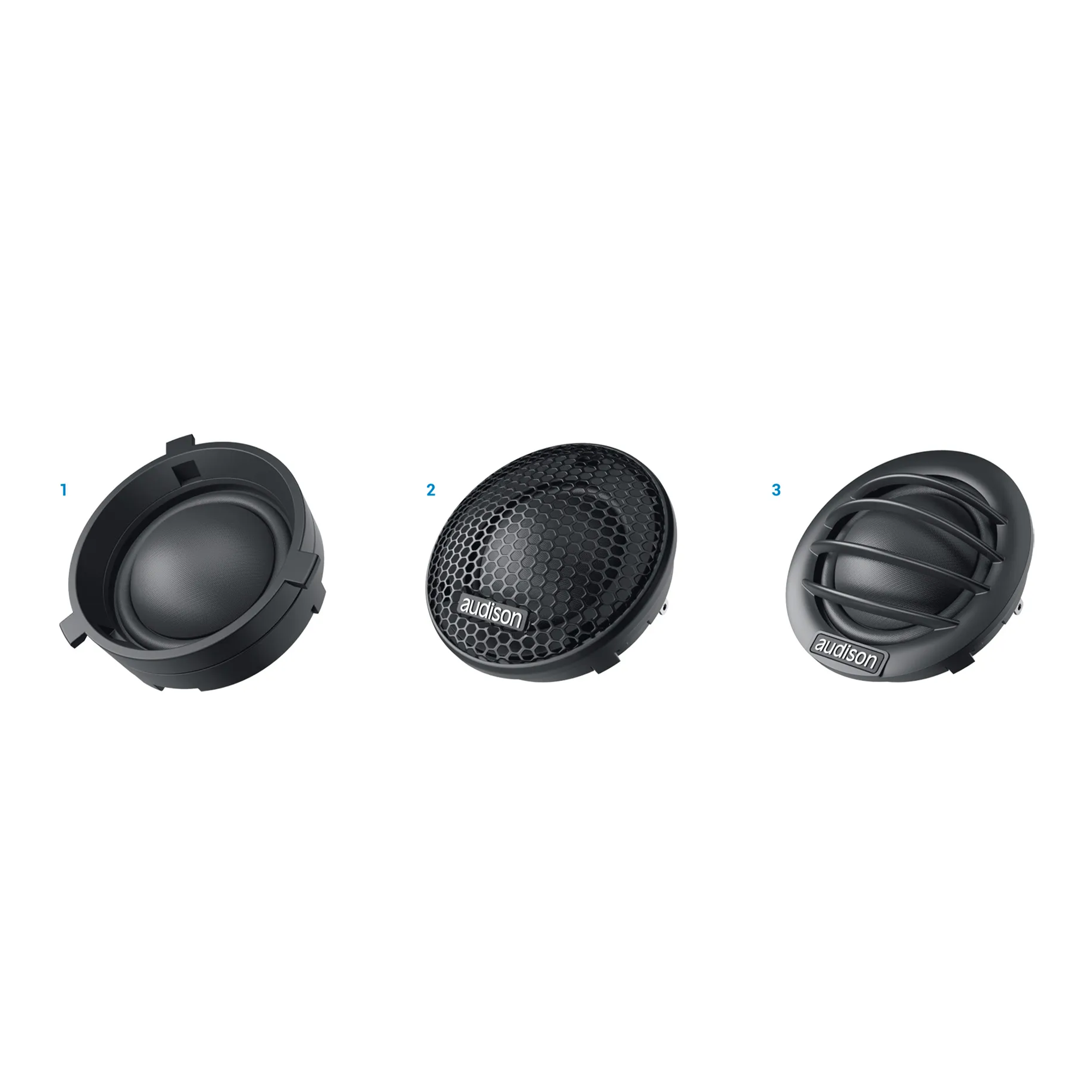 | Тип на високоговорителитеКоаксиални високоговорители: Коаксиалните високоговорители се характеризират с конструкция, наречена всичко в едно. Високочестотният и среднобасовият говорител са в един и същ кош. Предимството е по-лесен монтаж, но поради свързването или близостта на честотните диапазони в един говорител обикновено се понижава качеството на звука. Обикновено в центъра на среднобасовия говорител се намира високочестотният говорител, чиито звукова бобина работи във втората въздушна междина на общия магнитен кръг. Коаксиален говорител с три честотни диапазона се състои от среднобасов говорител, отпред на специален носач е поставен средночестотният говорител и отделен високочестотен. Компонентни високоговорители: Компонентните високоговорители се отличават с разделянето на отделни честотни диапазони: високочестотен + среднобасов + евентуално басов диапазон. Отделните говорители могат да бъдат разположени напълно отделно, което води до по-добро звуково и акустично представяне. В огромното мнозинство от случаите при компонентните високоговорители се доставя и външна кросоувърна мрежа, която разделя високите, средните/среднобасовите и при системи с три честотни диапазона и басовите честоти, както и позволява настройване на нивото в децибели на високочестотния говорител (напр. +2 dB, 0 dB, -2 dB), стръмността (напр. 6 dB/октава, 12 dB/октава) или активно/bi-amp свързване. | Високочестотни |