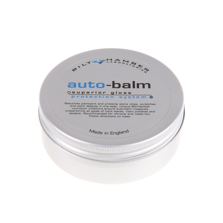 Bilt Hamber Auto-Balm е уникален восък, който осигурява защита и блясък на боядисани повърхности, хром или алуминиеви елементи на автомобила. Твърдият восък Bilt Hamber Auto-Balm е резултат от хиляди часове разработка и тестване на смес от синтезирани молекули, ограничаващи корозията, които могат да се свържат здраво и да останат ефективни дори във много тънък слой. Твърдият восък Auto-Balm може да запечата порите в лака и да осигури ефективна бариера срещу корозия. Този восък също може да предпази хром, алуминий, анодизиран алуминий и други сплави. Не съдържа абразиви. Ако лакът на вашия автомобил е в лошо състояние, преди восъчането или нанасянето на sealant е необходимо да го преполира и обезмаслите. В опаковката ще намерите и един апликатор Bilt Hamber. Восъкът не образува прах или прашинки при полиране. Предотвратява по-нататъшното разпространение на корозия от отлепени места или повреди. След внимателно преполиране на каросерията няма да остане защита върху лака и затова е много важно да защитите лака. Bilt Hamber Auto-Balm се нанася в тънък слой и след полиране с микрофибърна кърпа създава красив дълбок блясък с мокър ефект, който „подмладява“ автомобила ви и най-вече осигурява отлична антикорозионна защита.Основни характеристики