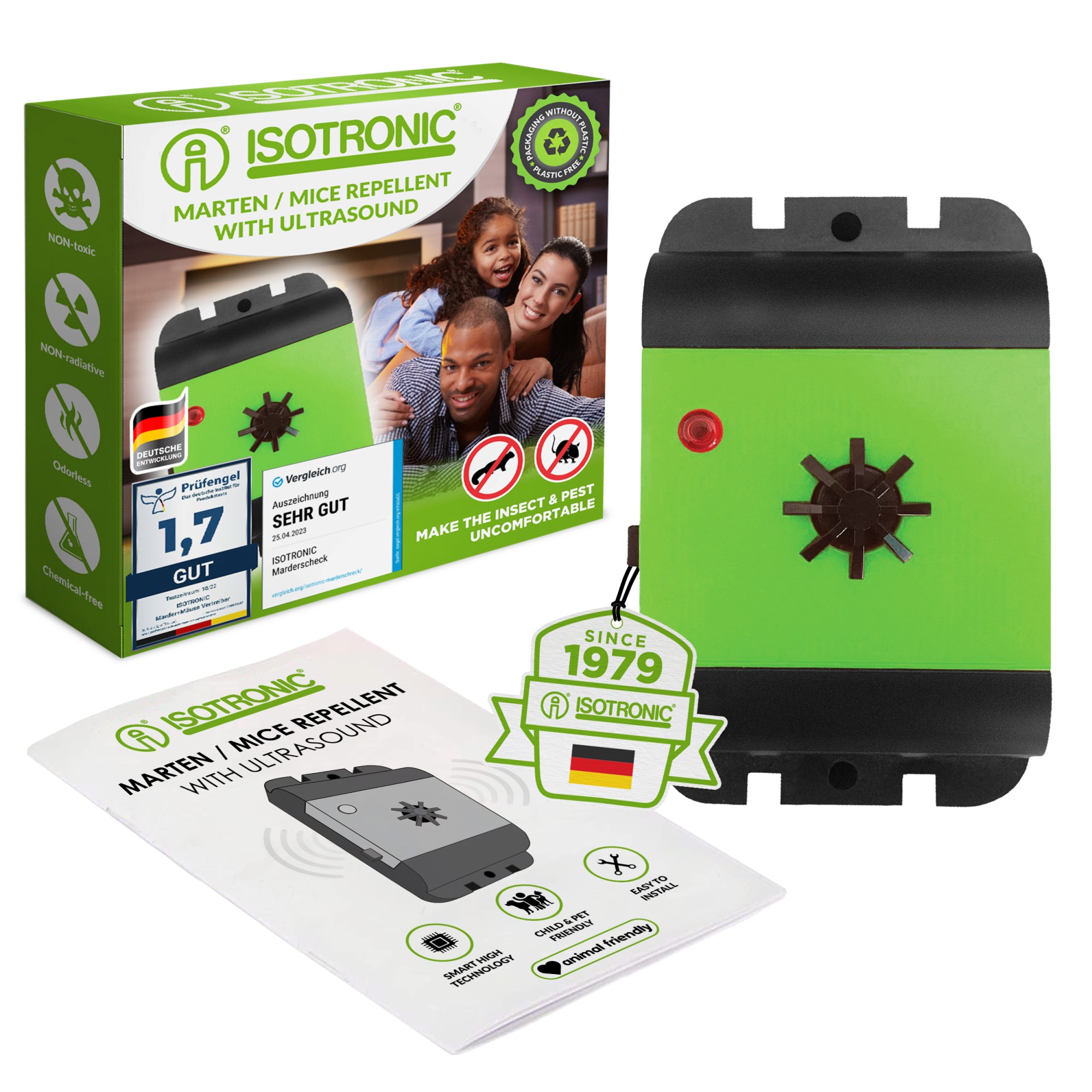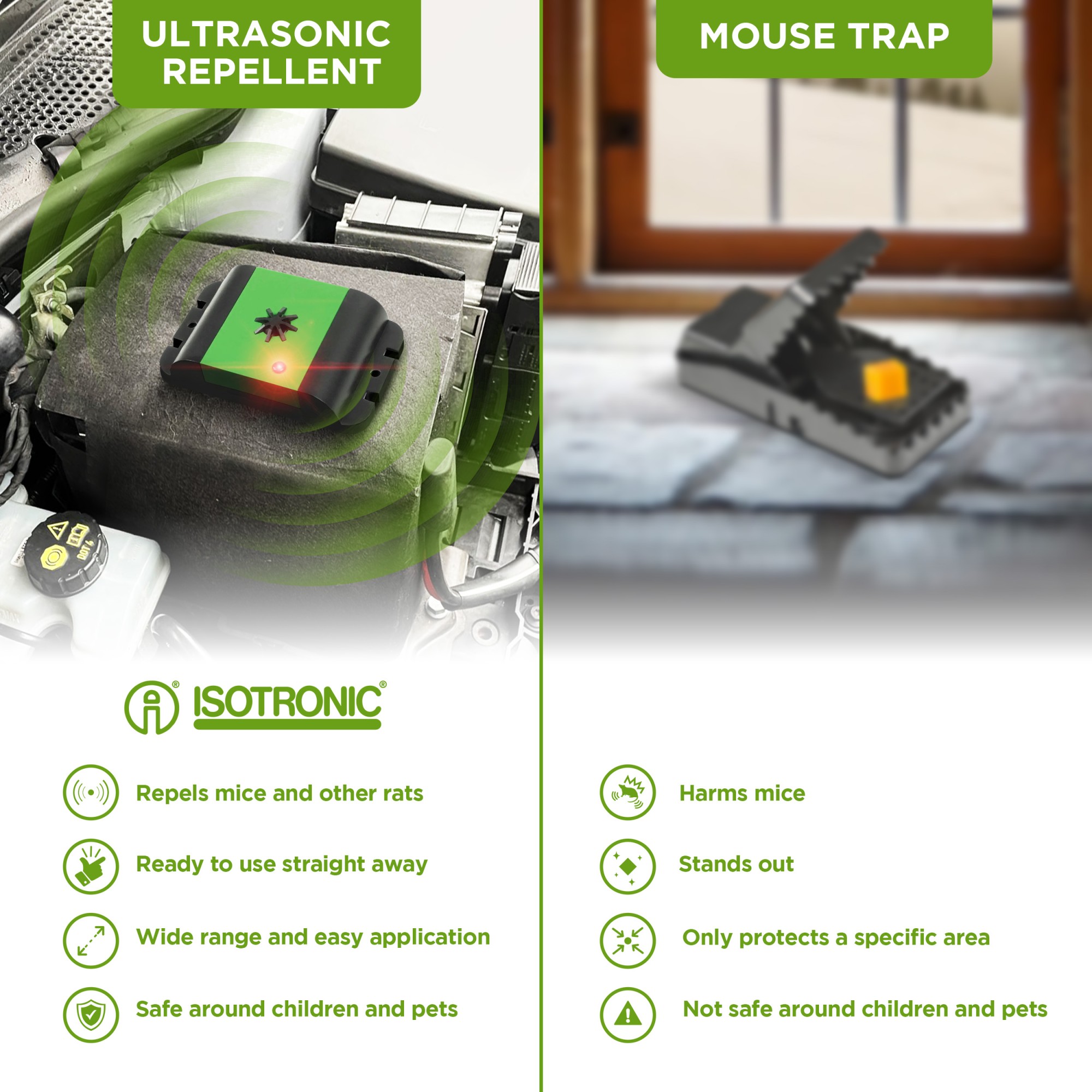 Отблъсквачите Isotronic представляват надеждно и щадящо решение за защита на превозни средства, домове или гаражи от нежелани посетители, като куни, мишки, плъхове или други вредители. Тези електронни отблъсквачи използват ултразвукови сигнали или пулсово напрежение, които са неприятни за животните, но напълно безопасни за човека. В асортимента ще намерите компактни модели, предназначени за монтаж в двигателното отделение, както и универсални устройства за използване вътре в сгради. Отблъсквачите Isotronic са известни с дълъг живот, ниска консумация и лесен монтаж. Защитете автомобила или имуществото си от повреди на кабели или изолация. С марката Isotronic получавате тих, но много ефективен пазител.