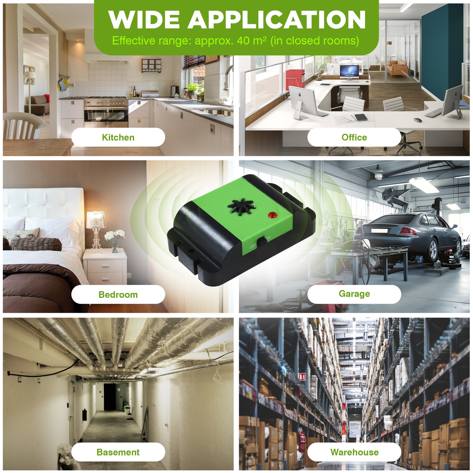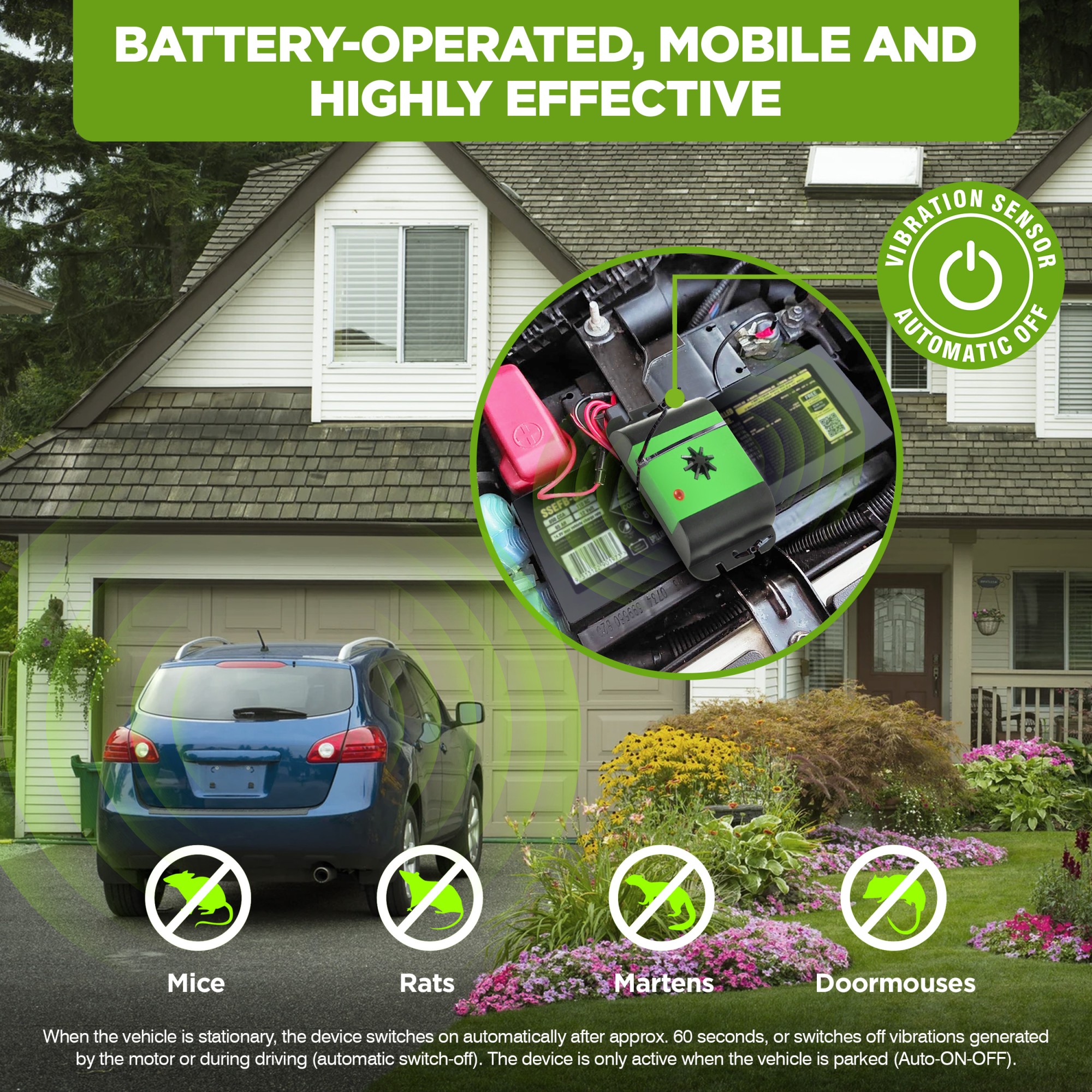 Универсален 23 kHz ултразвуков отблъсквач на гризачи. Устройството излъчва къси високочестотни звуци на 45-секундни интервали. M480 е идеален за защита на кабели в двигателното отделение на превозното средство. Устройството не изисква сложни връзки, тъй като се захранва от батерии (включени в комплекта). Вграденият вибрационен сензор засича, че двигателят е стартиран и автоматично се изключва, като по този начин удължава времето на работа. Интегрираната Q-технология гарантира постоянен интервален режим и стабилно излъчване.