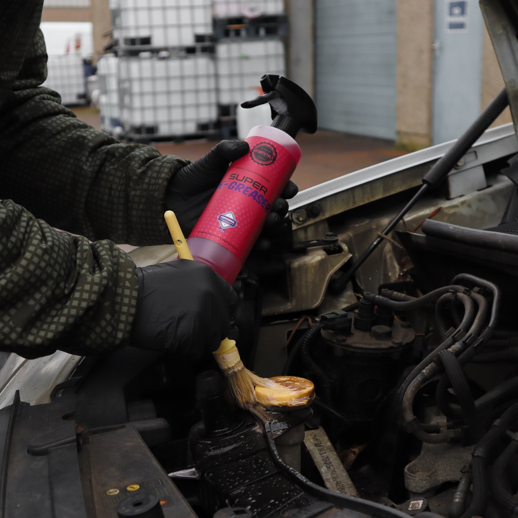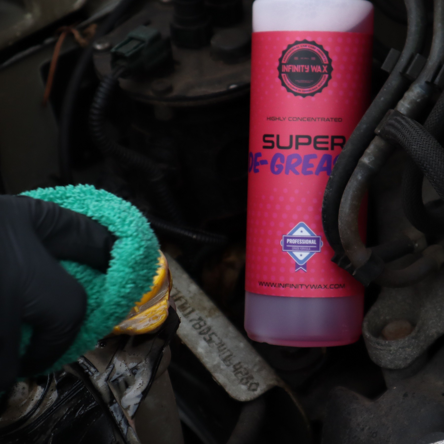 Infinity Wax Super De-greaser е продуктът, към който ще посегнете, когато универсалният почистващ препарат просто не е достатъчен. Неговата гелообразна консистенция позволява нанасяне, но също така прилепване и задържане върху замърсената повърхност до 20 минути. През този продължителен период продуктът стартира процес на емулгиране, за да се свърже с мазнината или маслото и да ви позволи много лесно да го изплакнете или избършете от повърхността. Това е почистващ препарат на водна основа, който е незаменим, ако почиствате двигател или пространството около него — перфектен почистващ препарат за моторното отделение. Неговите алкални, повърхностно-активни вещества са направени от най-мощния натриев материал в комбинация със силни емулгатори и разделителни агенти. Този многофункционален обезмаслител може да се използва по много начини — от нанасяне в чист вид до разреждане с помощта на пулверизатор. Препоръчителното разреждане е 200 ml продукт и 800 ml топла вода. Infinity Wax Super De-greaser може да използвате на всяка фаза от процеса на миене или като самостоятелен почистващ препарат.Основни характеристики