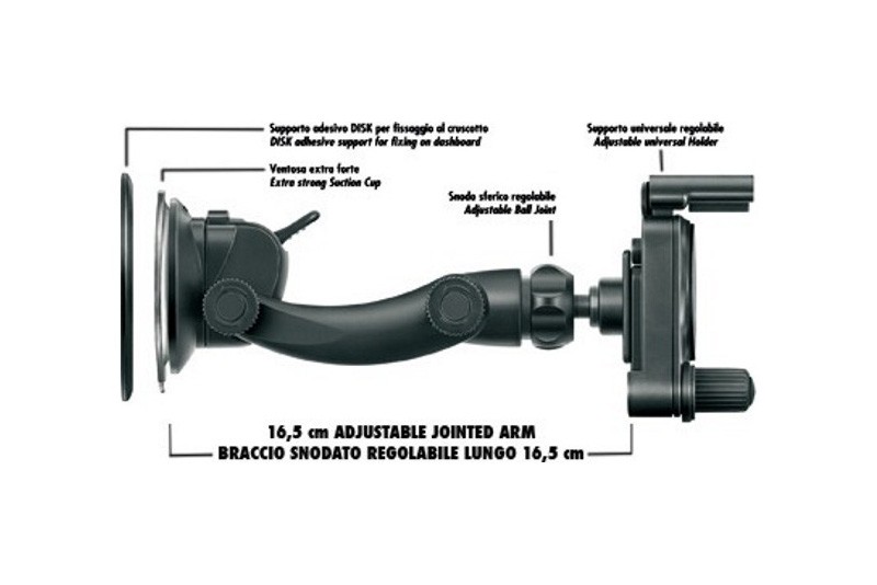 Шарнирен държач за навигация се състои от съединение на 16 cm рамо с топков шарнир и широко разтегаем държач - повече от 11 cm. FLEXGPS се отличава с голяма твърдост и в същото време с възможност за различни наклони. С помощта на прост заключващ механизъм може бързо да се закрепи на различни повърхности и осигурява здраво фиксиране за вашето устройство.- В комплекта е включен самозалепващ диск, позволяващ закрепване на стойката върху таблото.- В комплекта също така има адаптер за закрепване на произволно устройство (мобилен телефон, MP3 плейър...) към рамото на държача