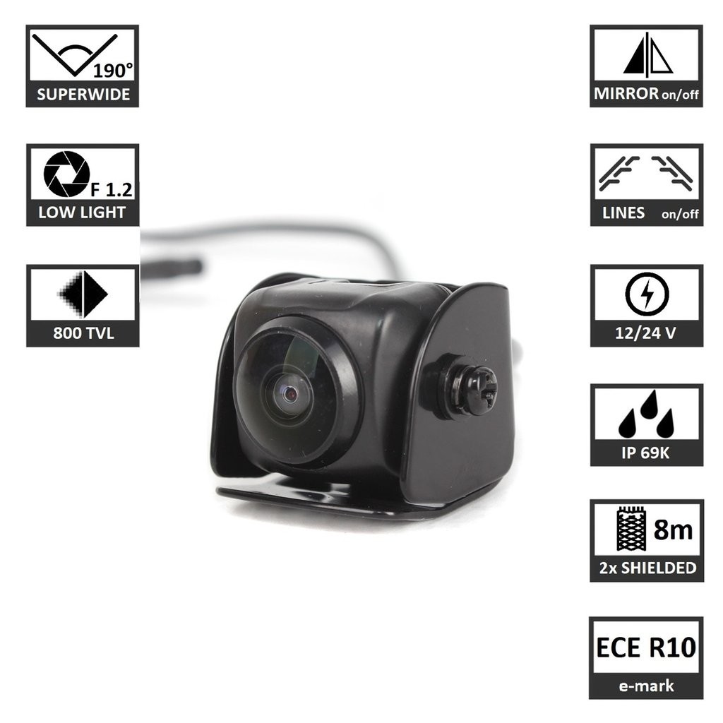 Универсална миниатюрна камера за паркиране с ъгъл на виждане 190°, предназначена за външен монтаж IP69K, с разделителна способност 800TVL, подходяща за използване като задна или предна, здрава метална конструкция, с възможност за включване на насочващи линии и смяна на ориентацията ляво/дясно на изображението. Наклонът на камерата е регулируем и може да бъде монтирана на хоризонтална или вертикална повърхност. Камерата може да бъде монтирана и без стойка (залепяне), в такъв случай размерите й са само 21 x 24 x 21 mm. С реален ъгъл на виждане 190° CAM7 може да вижда дори около ъгъла. Поради това тя е идеално решение за превозни средства като транспортни средства, ванове/кемпери или товарни автомобили. Тази камера елиминира опасни ситуации в градския трафик и е незаменим помощник при наблюдение на кръстосания трафик при паркиране. Ако е инсталирана отпред, можете да наблюдавате приближаващия трафик още преди да видите идващите автомобили през страничния прозорец. Тесните улички и гъстата застройка вече не са кошмар, а и колоездачите ще се чувстват по-сигурни.