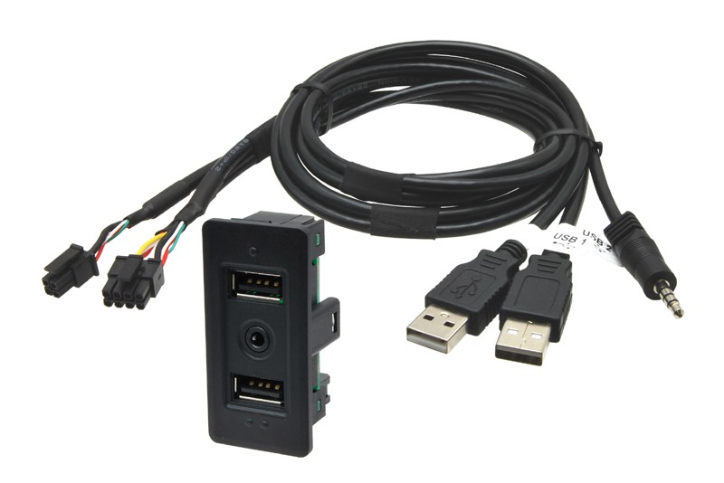 - Адаптер за свързване на 2x USB и AUX сигнал, който замества оригиналния конектор в автомобила при използване на допълнително инсталирано (aftermarket) авторaдио.