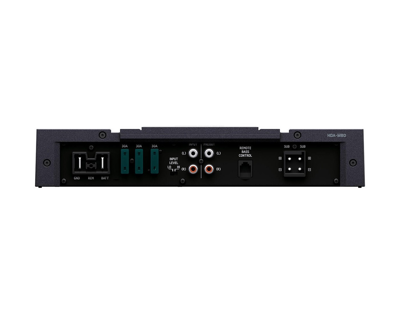 - Едностранен терминал - всички връзки (захранване, високоговорителни изходи, RCA входове/изходи и конектор за дистанционно управление на баса), както и всички предпазители са разположени на долната страна на усилвателя. Това улеснява постигането на чиста инсталация във вашия автомобил.