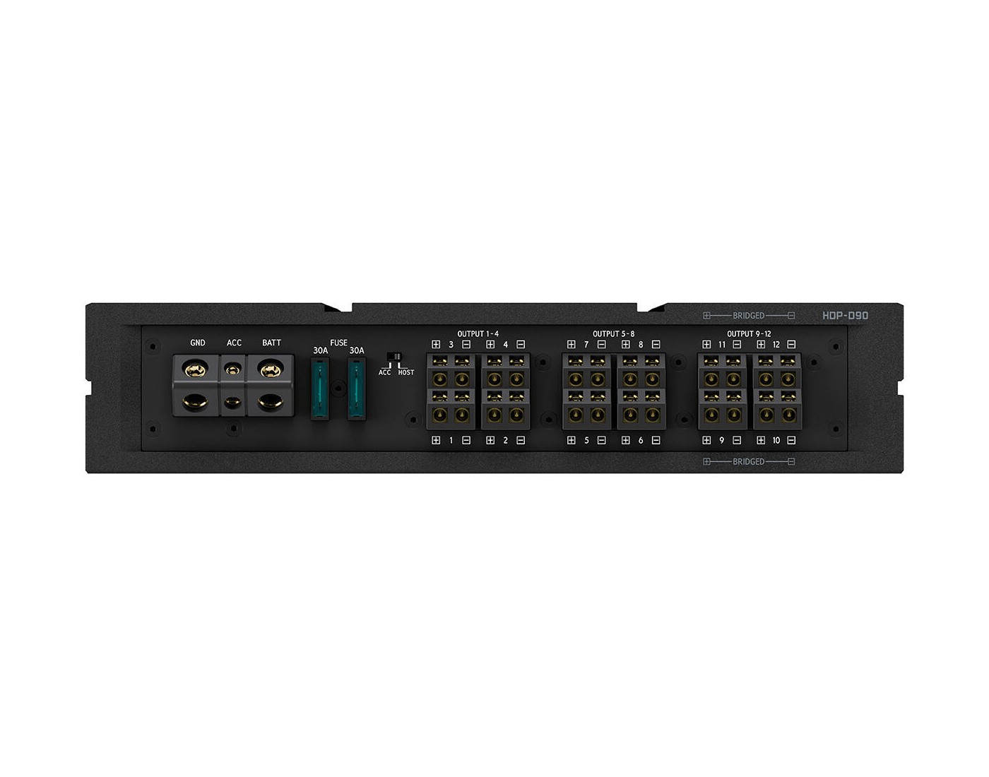- 12-канални, високопроизводителни входове - най-интересната характеристика на HDP-D90 са 12-каналните входове на ниво високоговорители с матрично сумиране на входовете. Това позволява свързване на HDP-D90 към повечето съществуващи фабрични аудио системи (дори и големи многоканални OEM системи), като в аудио веригата се заменят всички компоненти след основната единица. Това ви позволява да изградите желаната звукова система, като същевременно запазите оригиналното радио/навигационна система на вашия автомобил. Освен това има 2-канални RCA входове, оптични TOSLINK и коаксиални входове, както и Bluetooth Audio (с включен Bluetooth донгъл).