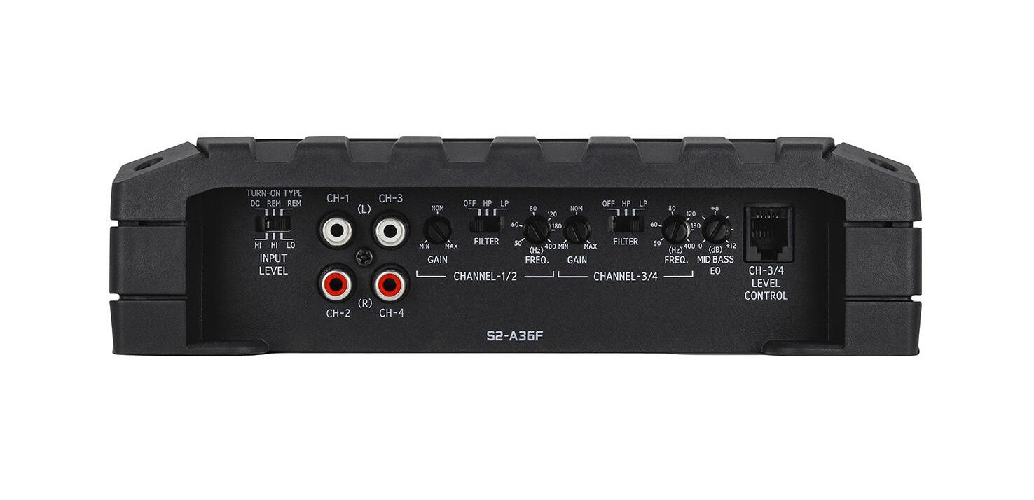 Новото поколение усилватели Alpine от серия S е проектирано да повиши вашето изживяване от автомобилното аудио на по-високо ниво при приемлив бюджет. Благодарение на новия елегантен дизайн и подобрените функции (в сравнение с предшествениците си) тези усилватели предлагат изключителна мощност и сила на разумна цена. Четириканален усилвател от серия S S2-A36F доставя 60 W RMS @ 4 Ω или 90 W RMS @ 2 Ω недокоснат, високо верен сигнал до всеки от предните и задните говорители на вашия автомобил, и придава приятно и чисто звучене на вашия автомобил. Усилвателят ще съживи вашата музика, тъй като е сертифициран за Hi-Res Audio, и с честотна отзивчивост до 40 kHz ясно ще разкрие нейните прецизни детайли и емоционална сила. При триканална двулентова система можете да използвате усилвателя и за захранване на двойка предни говорители с по 60 W RMS всеки и едновременно за захранване на субуфър с мощност 180 W RMS от мостирани задни канали. Регулируемото усилване на средните баси на тези задни канали ви позволява да изберете допълнителен натиск и ударност на нискочестотния звук на системата. Можете дори да добавите по избор кабелен дистанционен контролер RUX-KNOB2 и да управлявате нивото на задните канали от предната седалка. Високо- и нискочестотните филтри ви позволяват да контролирате честотния спектър, който достига до говорителите и субуферите. Усилвателят съдържа входове на ниво предусилвател и на ниво говорители, така че можете да го инсталирате почти във всяко превозно средство, дори и в автомобил с фабрично радио. При използване на входовете на ниво говорители усилвателят може да разпознае входящия сигнал и да се включи сам, като по този начин отпада необходимостта от отделен включващ проводник към приемника или кутията с предпазителите.
