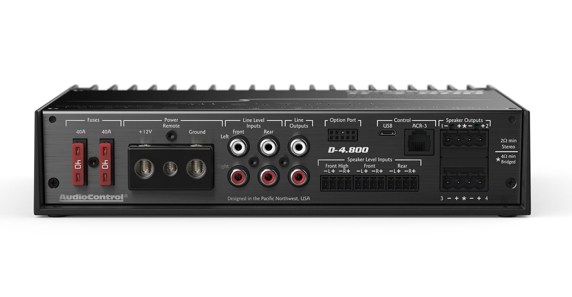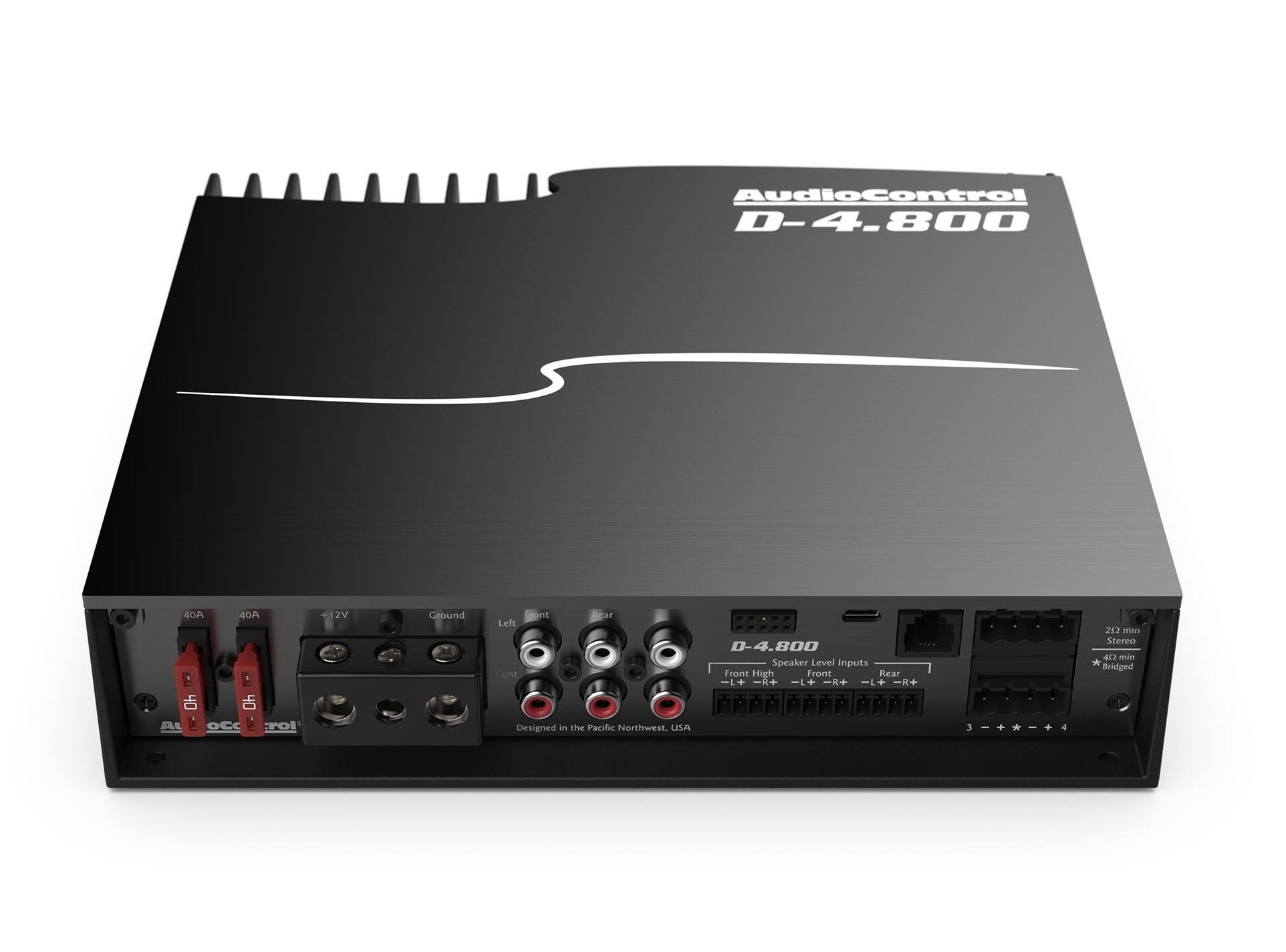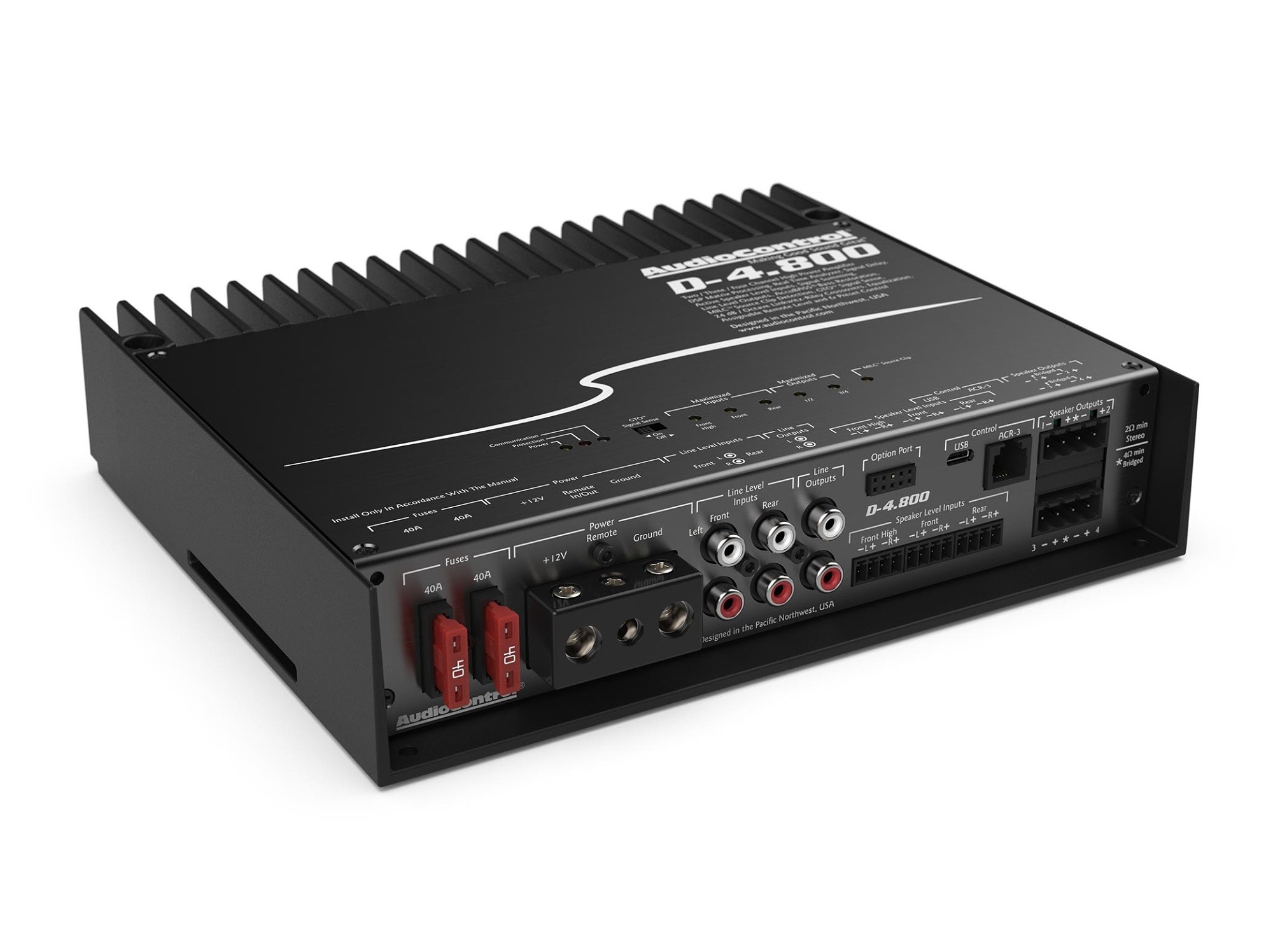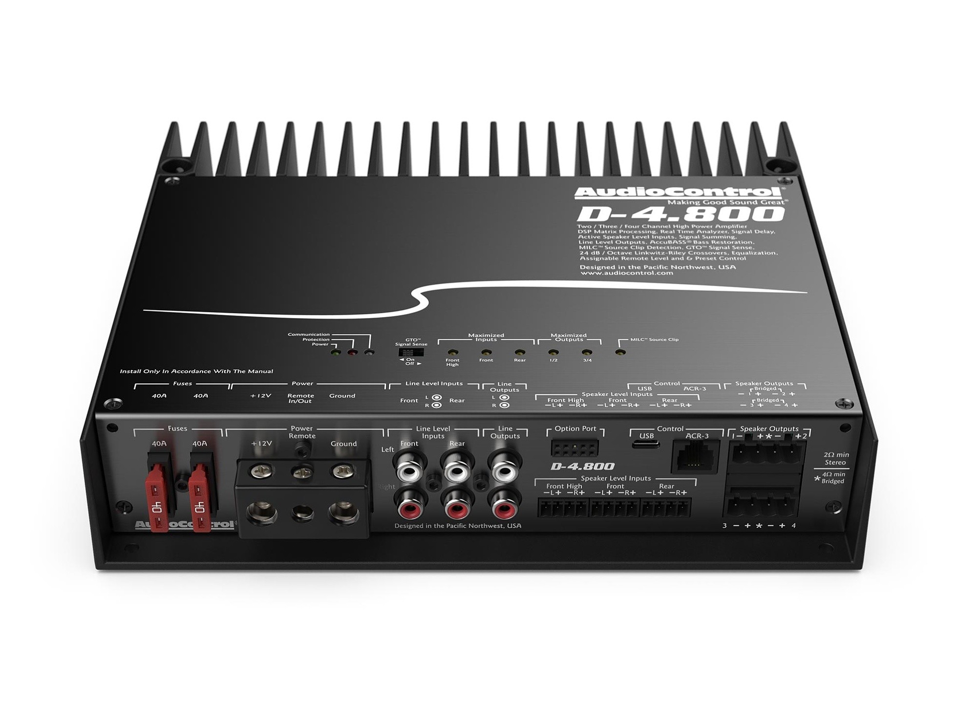 Наградените усилватели AudioControl в комбинация с мощния процесор, който ще откриете в отделните DSP процесори AudioControl DM-608 и DM-810, ви предоставят перфектно решение в един продукт. Усилвателите AudioControl Matrix DSP включват множество функции за лесна интеграция към фабричната система като суматор на сигнала, AccuBASS® или MILC™ заедно с най-добре звучащото усилване от клас D в света, както скромно твърдят в AudioControl. Инженерите на този американски производител съчетаха многократно отличаваната технология на техните усилватели с мощния Matrix DSP в D-4.800. Това решение предоставя безпрецедентна мощ и гъвкавост при настройване, за да постигнете съвършен звук от вашата фабрична или aftermarket аудио система. D-4.800 съдържа активни входове на нивото на говорителите, линейни входове и изходи, а приложението DM Smart DSP от AudioControl ви дава пълен контрол над всички функции включително 30-лентов еквалайзер, забавяне на сигнала, забавяне на входа, полярност и собствените функции на AudioControl като AccuBASS®, GTO™, Signal Sense, MILC™ и вграден входен и изходен RTA. Вграденият Option Port на D-4.800 е бъдещето на автомобилното аудио и позволява стрийминг с висока резолюция директно в DSP. Той също така отваря възможности за бъдещи проприетарни връзки за допълнителни входове, контролери и интерфейсни решения. AudioControl D-4.800 обединява мощ и интелигентна гъвкавост в едно красиво алуминиево шаси.