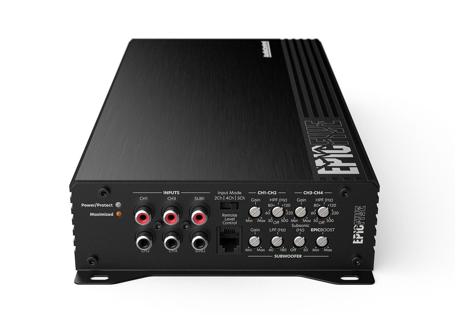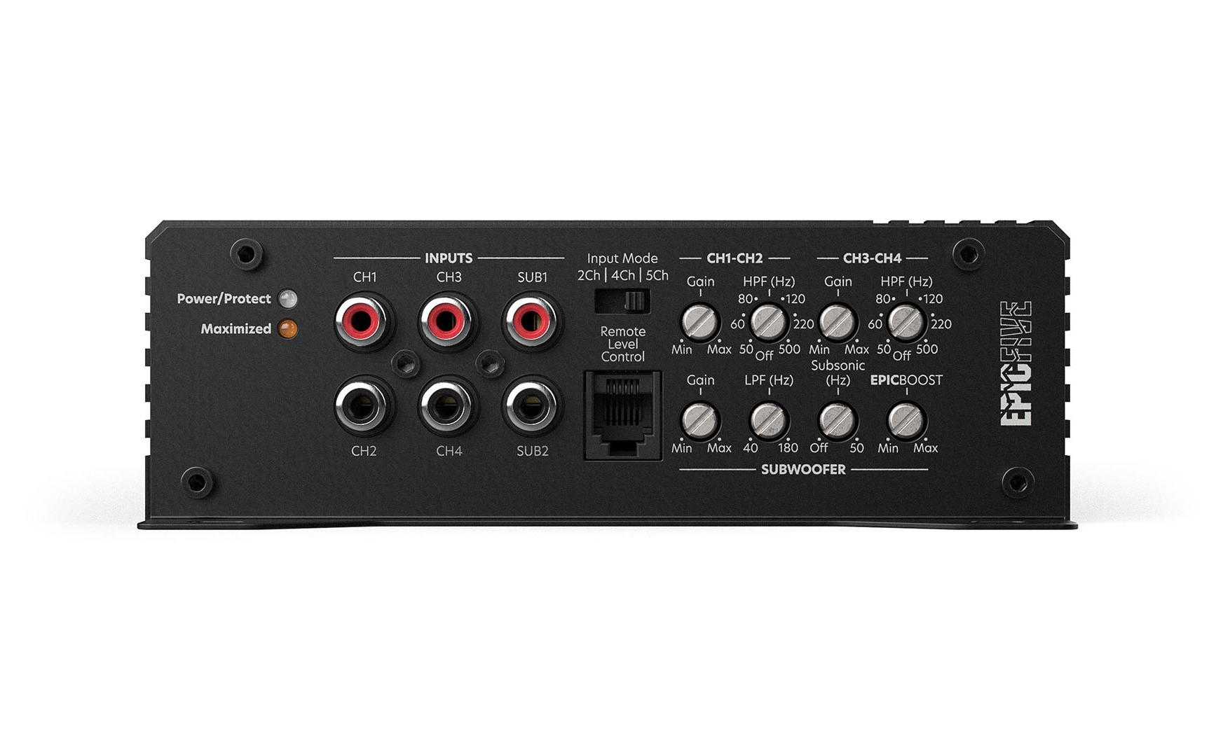 Усилвателите AudioControl от серията EPIC комбинират висока мощност, компактни размери и стабилна работа при ниска импеданс. Те са проектирани за задвижване на субуфъри и мощни говорители и благодарение на цифровата Class-D технология осигуряват ефективен пренос на енергия дори при тежко натоварване. Моделът EpicFive е петканален усилвател, който предлага четири канала за говорители и отделен високо мощен канал за субуфър. Благодарение на това е идеално решение за пълно озвучаване на автомобила с един усилвател. Стабилната работа до 1 Ω на субуфърния канал позволява свързване и на по-взискателни бас системи. В комплекта е включено дистанционно управление ACR-E за проста регулация на баса директно от мястото на водача. EpicFive може да се свърже с процесора The Epicenter Bass Restoration, с който басовата част ще получи още по-голям контрол и детайл. Усилвателят е оборудван с интелигентни защитни вериги с автоматично нулиране и здрави винтови клеми, които осигуряват надеждно свързване.