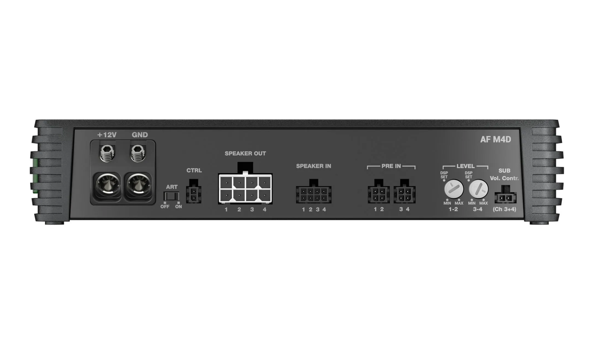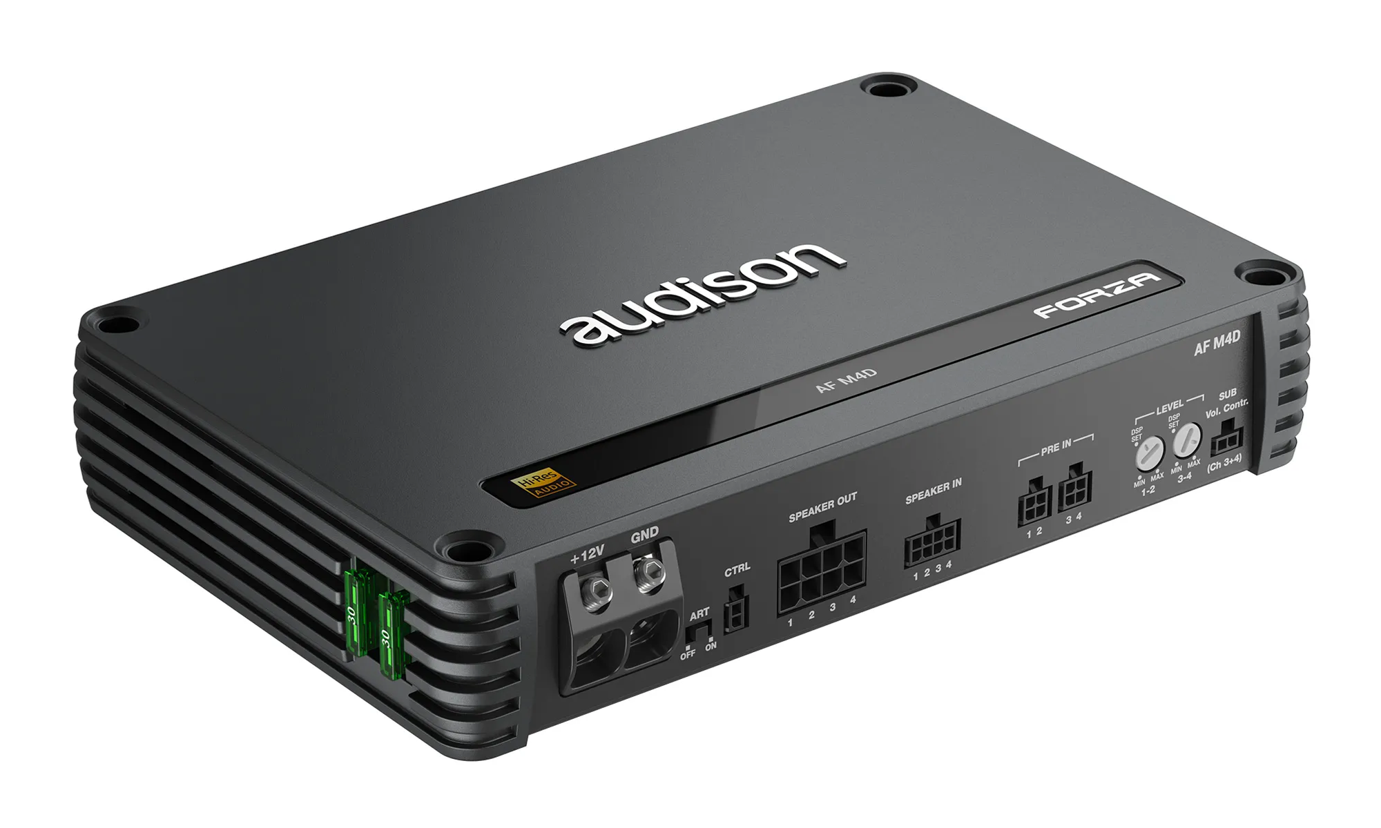 Усилвателите Audison AF Forza са проектирани да добавят мощни усилвателни канали към усилвателите със бит процесор AF. В комплекта е включен plug & play кабел за вход на сигнала, който улеснява свързването към bit усилвателите AF. Самостоятелните AF усилватели са също перфектни за използване със системи, управлявани и контролирани от отделен bit процесор, като bit One HD Virtuoso. AF усилвателите имат „директна“ архитектура без функции на аналогов предусилвател, като филтриране на кросоувъри, и са предназначени за използване с външни процесори. AF M4D се гордее с четири високо вярно усилени канала 160 W x 4 при 4 Ω, 260 W x 4 при 2 Ω с аудиофилен звук от най-новото поколение технология Audison D-Class. По-високите честоти на превключване, по-стръмното филтриране и компонентите с по-висока толерантност предоставят звук над очакванията на клас D — в удивително компактен корпус! Звуковият обхват е разширен до 40 kHz и постига желаната сертификация High-Resolution. Резултатът от мостовото свързване на двойки канали е 520 W x 2 при 4 Ω, което гарантира гъвкава и мощна производителност.