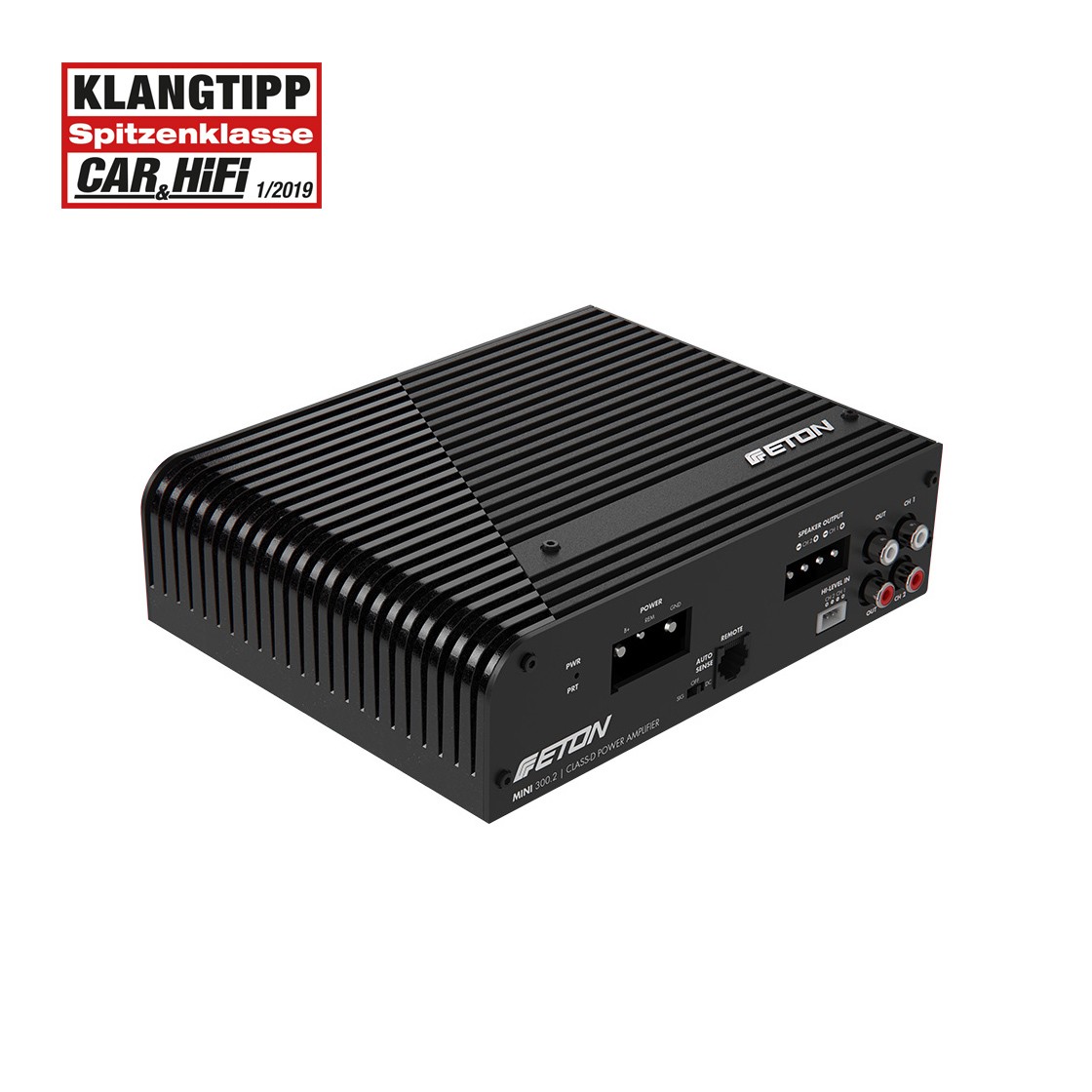 2-канален усилвател с малки размери, но с много висока мощност 2 x 185 W при 4 Ω, 2 x 310 W при 2 Ω и 1 x 620 W при 4 Ω в мостов режим (RMS стойности). Интересна е модулната система за закрепване и горната лента, под която са скрити настройките на усилвателя. Усилвателите Eton Mini работят в енергиен клас D.