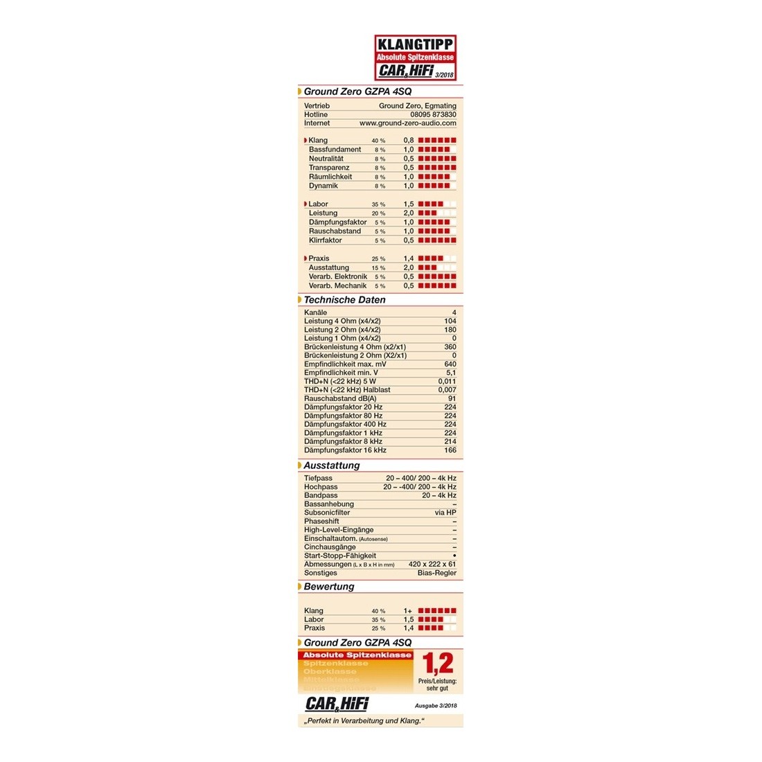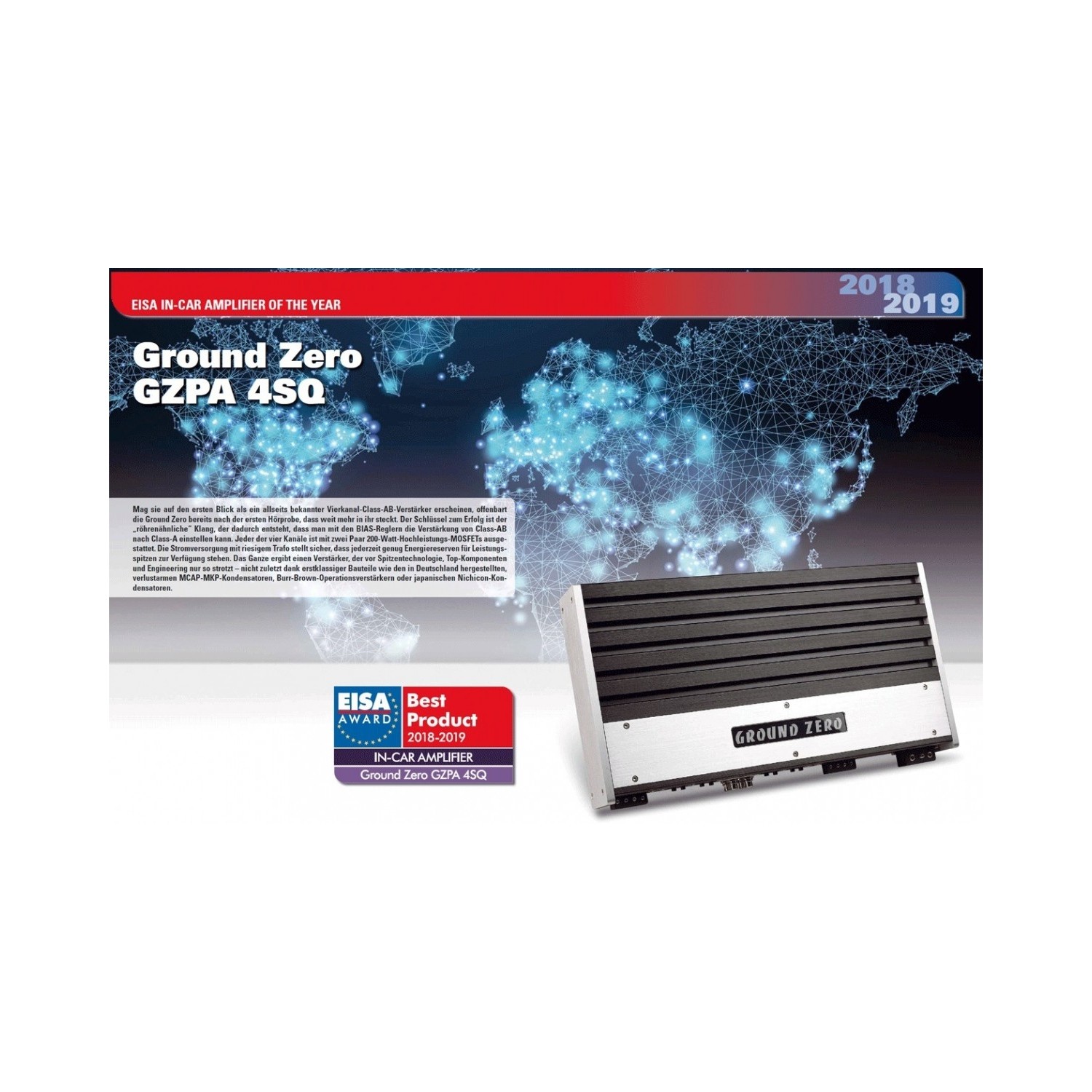 Ground Zero Audio е световно призната марка в областта на автомобилната аудиотехника, която е основана още през 1995 г. в Германия. От създаването си е изградила здрава позиция на пазара благодарение на водещите технологии, прецизното инженерство и акцента върху качеството на звука. Ground Zero се специализира в цялостни решения за озвучаване на автомобили, от висококласни говорители за автомобили, през мощни субуфъри, до усилватели предназначени за SPL или SQ. Продуктите на Ground Zero са известни с издръжливостта си, високата мощност и вярното възпроизвеждане на музика, което се потвърждава от многобройни награди от престижни световни състезания в категориите Sound Quality (SQ) и Sound Pressure Level (SPL). Производителят при разработката използва най-съвременни технологии, като измервателната система KLIPPEL® и стандартите CEA 2006-A, за да осигури максимална точност и надеждност на всеки компонент. Със слогана "Respect The Music" Ground Zero Audio подчертава своята философия - да предложи на слушателите автентично музикално изживяване, което вярно улавя емоциите на всяка песен. Ако търсите първокласно решение, говорители за кола или субуфъри, които се отличават не само с производителност, но и с качество на изработката, Ground Zero Audio е правилният избор за взискателните клиенти по целия свят. Ahifi е единственият ексклузивен вносител на марката Ground Zero за Чешката и Словацката република.| Каталожен номер | GZPA 4SQ |