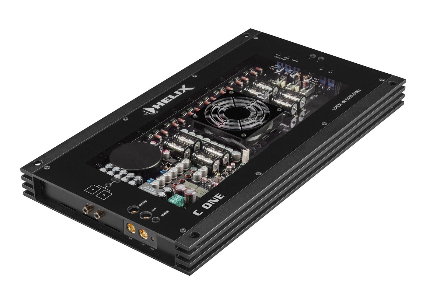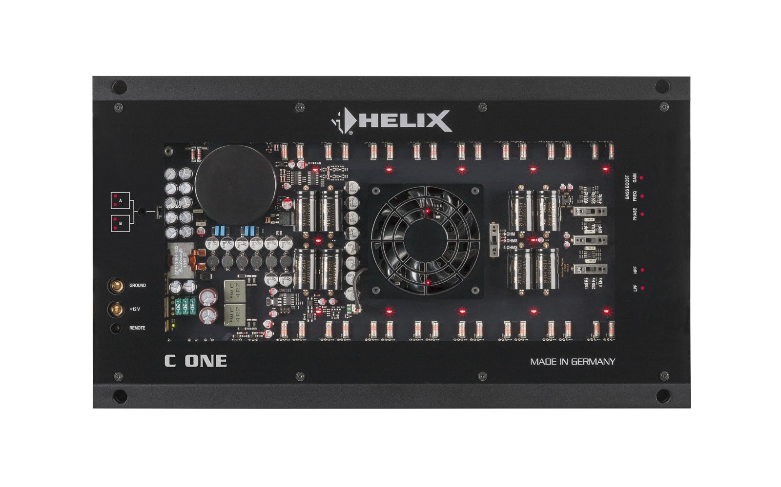 Helix C One е върхов едноканален усилвател, който може да активира и мощни субуфъри до максимум с удивително качество на звука. Стъпалото на преобразувателя от клас A с изключително нисък шум и изкривяване захранва общо 32 мощни MOSFET транзистора, което води до невероятен демпинг фактор 1000 за неуморен контрол над всеки говорител. Интелигентното регулиране на захранването осигурява стабилни условия за крайните степени и феноменална изходна мощност, която е почти независима от напрежението на акумулатора. А за още по-голяма изходна мощност два усилвателя C One могат да бъдат комбинирани в едно мощно устройство благодарение на TwinPower Link. Въпреки впечатляващата изходна мощност, C ONE не е в никакъв случай чист субуферен усилвател. Благодарение на разширената честотна отзивчивост до 80 kHz и архитектурата, проектирана до последния детайл за максимално качество на звука, C One е също перфектен "партньор" за мощни средночестотни високоговорители в концепции на аудиофилски системи. В комбинация с опционалния цифров входен модул HDM 1, C ONE демонстрира перфектния преход в дигиталната ера. HDM 1 приема цифрови аудио сигнали до семплинг честота 96 kHz чрез своя оптичен вход, последван от първокласни D/A преобразуватели BurrBrown с 32-битово разрешение, които трансформират сигналите обратно в аналогова домейн. Поради това C One е напълно подготвен за бъдещето и за комбинация с цифровите процесори Helix.