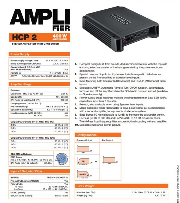 Hertz HCP 2 е стерео усилвател 400W, проектиран да разширява или настройва фабричната система с максимална простота. Всички усилватели Hertz Compact Power са сглобени от висококачествени компоненти. Системата за разсейване на топлината е оптимизирана така, че топлината да се прехвърля към радиатора и след това да се разсейва по страничните части на усилвателя. Включва филтри Bass Boost (0 ÷ 12 dB) за подсилване на ниските честоти.Усилвател Hertz HCP 2 използва следните технологии
