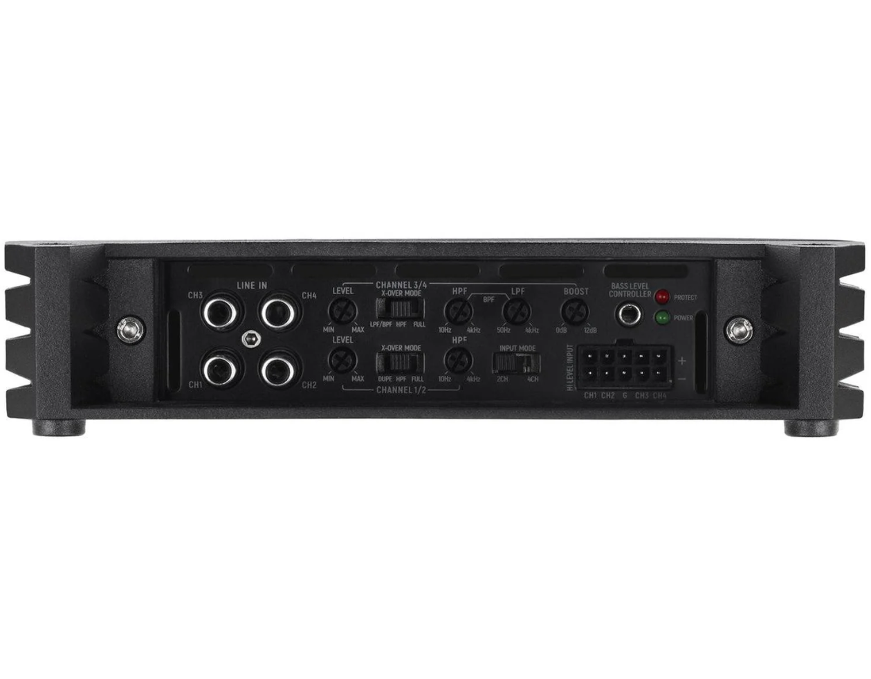 | Филтър за високи честоти (HPF)HPF / HP или "hi pass filter" предлага възможност за настройка на усилвателя чрез потенциометър така, че средните, евентуално среднобасовите и високите честоти да възпроизвеждат от определена честота нагоре. Пример: Усилвателите най-често имат HPF от 40 до 300 Hz. Ако настроим на потенциометъра стойност ок. 150 Hz, звукът ще бъде отсечен така, че ще възпроизвежда честоти от 150 Hz до максималната горна граница на целия честотен обхват на усилвателя, примерно до 20.000 Hz. Препоръчваме да настройвате този потенциометър в диапазона 80-160 Hz. Благодарение на тази възможност за настройка, високоговорителите понасят по-голяма мощност, тъй като няма да ги претоварвате с баси в долния честотен диапазон. | 10 - 4000 Hz |