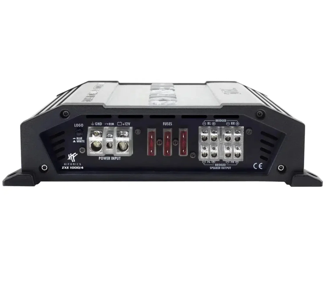 Брушираният алуминиев радиатор в сиво е сам по себе си приятна за окото гледка. Черните крайни капаци от леян под налягане алуминий допълнително подчертават стойностния вид на серията ZEUS EVOLUTION ZXE. Визуалният връх е подсветеното лого Hifonics, което може да се превключва от синьо на бяло. Но не само логото – и клемите за захранване и за говорители светят в типичното Hifonics синьо, придавайки на устройството още един атрактивен визуален ефект.