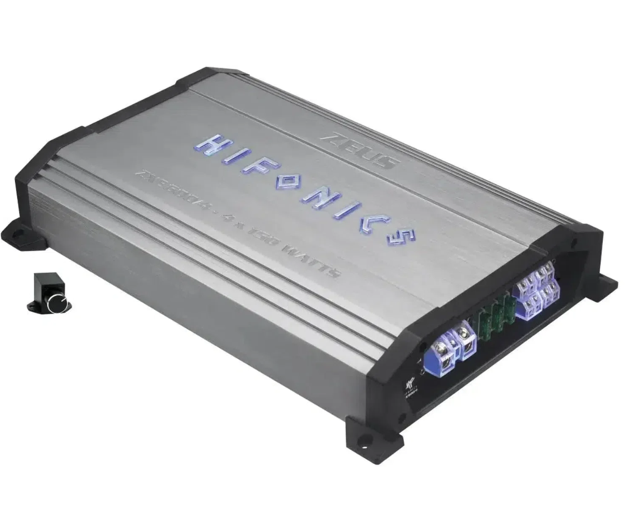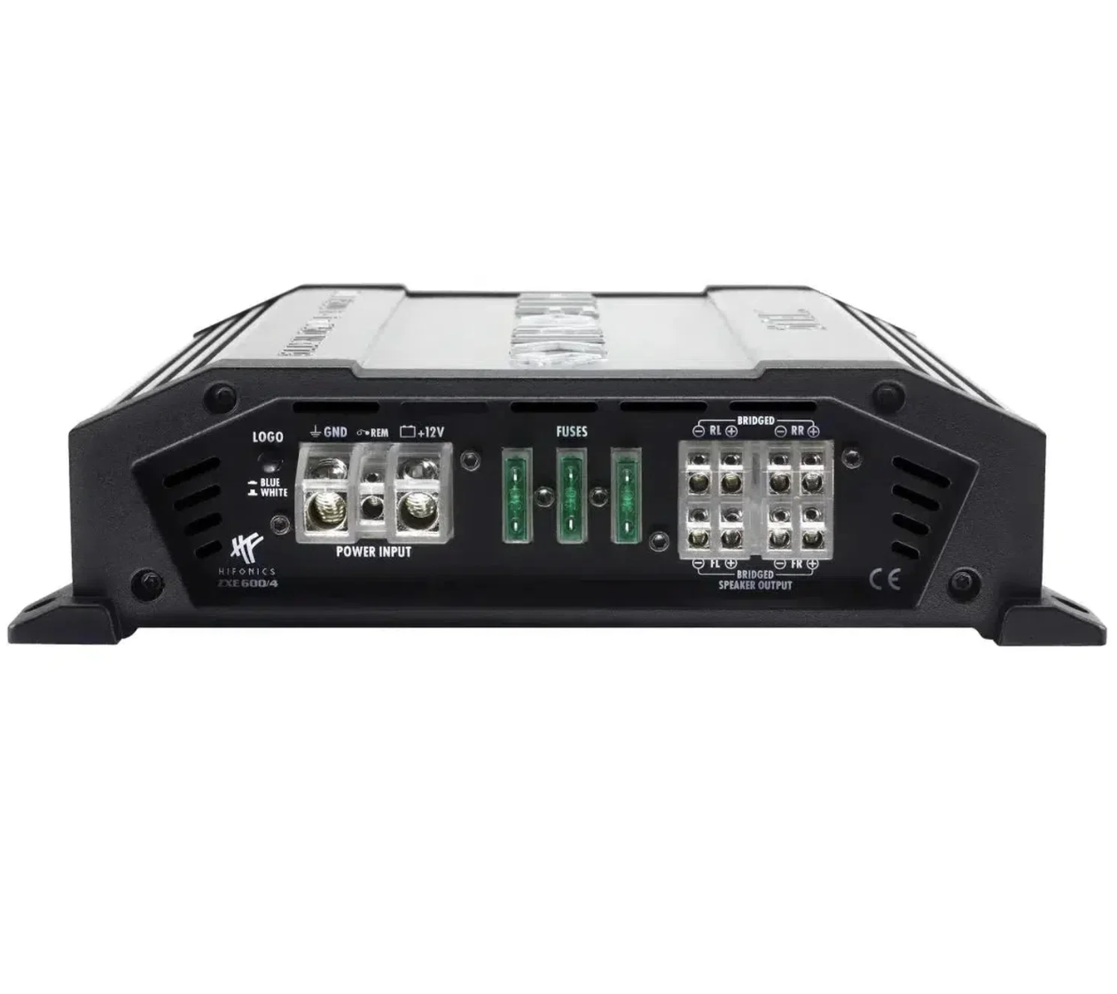 Брушираният алуминиев радиатор в сиво е сам по себе си приятна за окото гледка. Черните крайни капаци от леян под налягане алуминий допълнително подчертават стойностния вид на серията ZEUS EVOLUTION ZXE. Визуалният връх е подсветеното лого Hifonics, което може да се превключва от синьо на бяло. Но не само логото – и клемите за захранване и за говорители светят в типичното Hifonics синьо, придавайки на устройството още един атрактивен визуален ефект.
