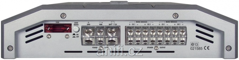| Брой каналиУсилвателите се разделят на: - моноблокове - 2-канални - 3-канални - 4-канални - 5-канални - 6-канални - многоканални Всеки канал служи за захранване на един високоговорител при коаксиален тип или на една страна, ако става въпрос за компонентни високоговорители. Усилвателите от тип моноблок се използват предимно за субуфери. 2-каналните са подходящи както за субуфери, така и например за преден чифт високоговорители в автомобила. 3-каналните се използват за предни или задни високоговорители + субуфер. 4-каналните се използват за предни + задни високоговорители или 1 чифт високоговорители + субуфер. 5- или 6-каналните обикновено се използват за 2 чифта високоговорители + субуфер. Бриджиране означава свързване на усилвателя в мост, когато се използва + полюс от един канал и - полюс от другия канал. В повечето случаи това е означено на усилвателя като "BRIDGED". | 4/3/2 |