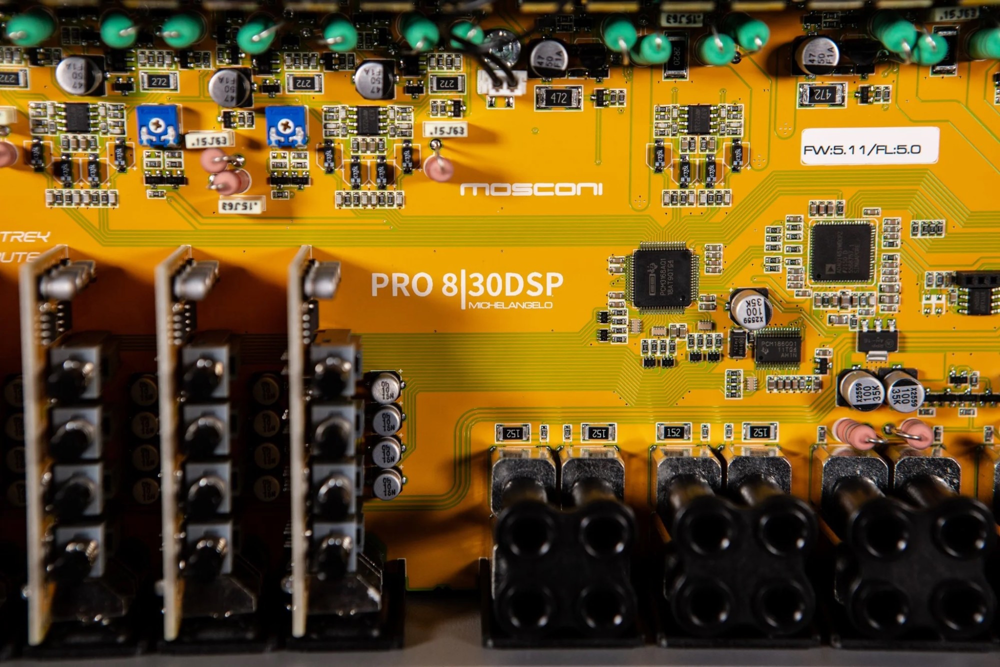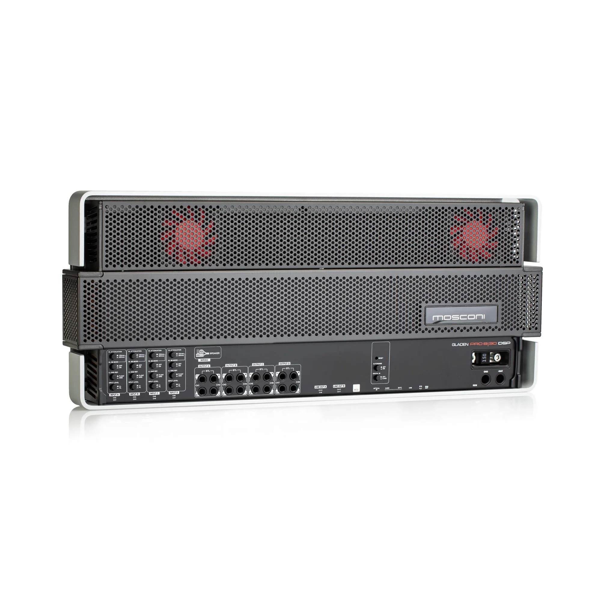 MOSCONI PRO 8|30 DSP задава стандарти в областта на многоканалните high-end DSP усилватели. С напълно аналоговата си мощностна секция в изходния диапазон MOSCONI PRO 8|30 DSP поставя стандарти в възпроизвеждането на музика и така превъзхожда цифровите усилватели по разделителна способност и пространствена детайлизация. Безкомпромисен в дизайна, 8-каналният мощностен усилвател MOSCONI PRO 8|30 DSP впечатлява с безусловна изходна мощност и отлично звуково преживяване при върхово качество. С интегриран 12-канален DSP (включително 4-канален преизход) са възможни почти всички мислими системни конфигурации. Мощностният усилвател е съвместим с High Level и Class SB. Втората най-висока серия усилватели PRO от Mosconi крие най-съвременни технологии и висококачествени компоненти за върхово качество на звука. Усилвателите от серия PRO са резултат от усилията на инженерите на Mosconi да създадат истински high-end продукти с върхово качество на звука, което почти се доближава до най-високата серия Zero. Целта на разработката не е била нищо друго освен първокласна музикалност, верен звук с надстандартна мощност и максимално удоволствие от слушането на любимата ви музика. Именно за това в Mosconi заложиха при многоканалните решения на аналоговия клас AB, който и в днешната ера на дигиталните усилватели продължава да се отличава с естествен и „топъл" звук. Предлагането на общо пет аналогови усилвателя се допълва от мощен моноблок за върхови субуфери. Гъвкавото разпределение на енергията, високата мощност и отличният звук правят усилвателите Mosconi от серия PRO оптимални партньори за активни системни конфигурации. Модерният дизайн с всички контролни елементи и конектори от една страна, както и вграденият вентилатор позволяват гъвкава инсталация дори в затворени пространства.Основни характеристики на усилвателя Mosconi Gladen PRO 8|30 DSP