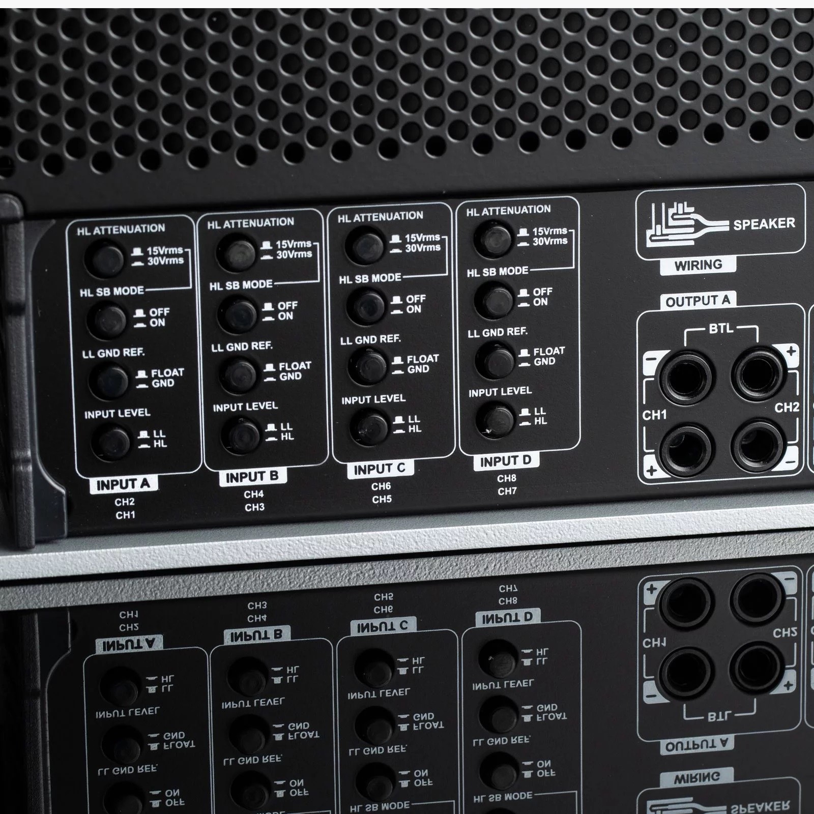 8-канален усилвател, 4 x 90 + 4 x 170 W RMS (4 Ω), 4 x 115 + 4 x 220 W RMS (2 Ω), вход с високо ниво, клас AB