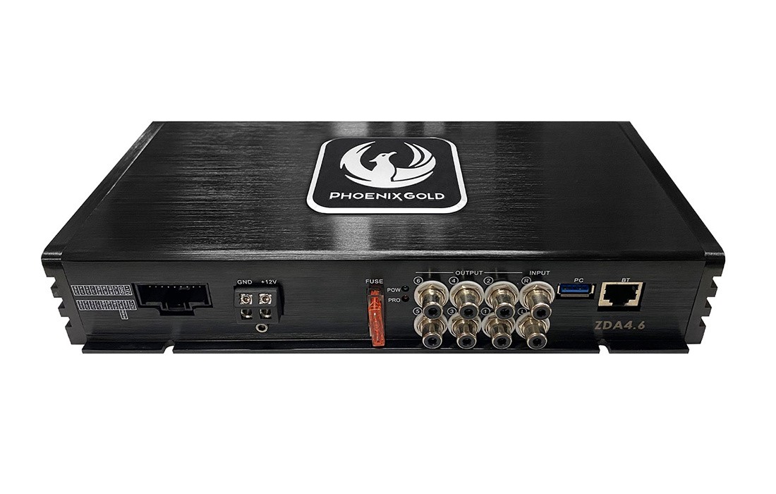 Phoenix Gold ZDA4.6 е изключително универсален дигитален процесор на сигнал (DSP) с вграден 4-канален усилвател. 6-каналният DSP ви предоставя всички функции, необходими за създаване на перфектната ви аудио настройка, като напълно настраиваеми филтри, еквалайзер с регулируемо Q и времева корекция. Този усилвател, пълен с функции, не спира дотук — вграденият усилвател 4 x 60 W RMS работи на канали 1 до 4 на DSP, така че имате пълен контрол. Ако желаете още по-голяма мощност, можете дори да използвате 6-каналните RCA изходи, които също се управляват от DSP.