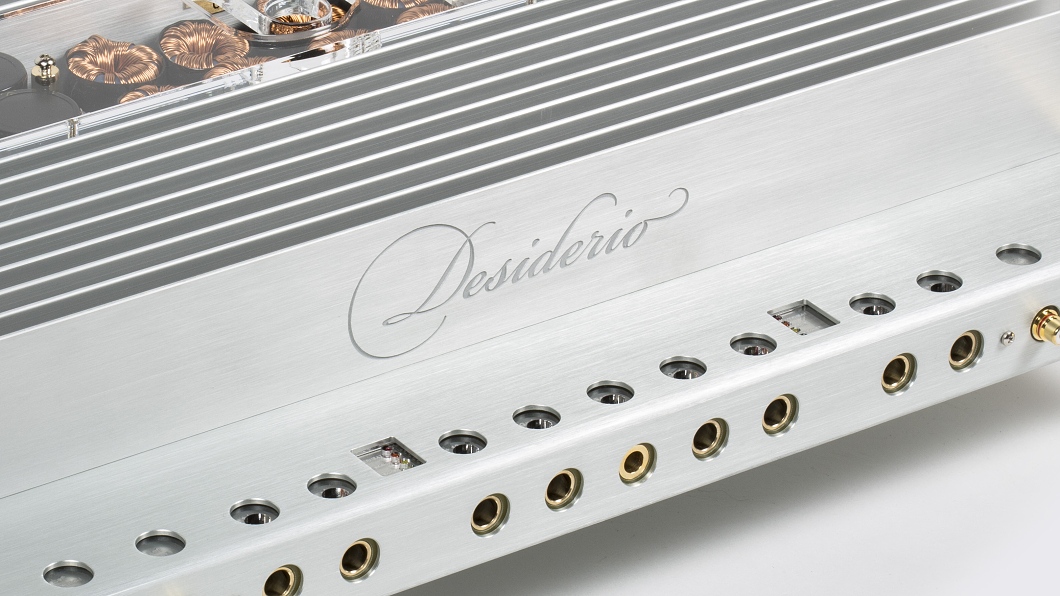 Desiderio не е просто класически двуканален усилвател. По същество, както Opus, той се състои от два напълно отделени моно усилвателя, разположени в това уникално шаси. Концепцията на усилвателя е много проста: да запази звуковия сигнал, преминаващ през цялото устройство, по възможно най-простия начин. Захранвания тип Push-Pull с 4 електрически трансформатора и 4 MOSFET-а са отделени за всеки канал поотделно. Desiderio е 100% независим усилвател, който при конструиране не е ограничен от интегрирани компоненти. За сглобяването му след няколкогодишно изследване бяха използвани и най-добре комбинирани най-висококачествени компоненти от целия свят. Всички основни платки на усилвателя преминават процес на позлатяване с 24-каратово злато, за да се подобри електрическата проводимост на техните пътища. При поглед към Desiderio веднага става ясно, че е използван голям брой кондензатори на входните и изходните степени, за да се избегнат проблеми при голямо натоварване. Обичате ли числата? Desiderio съдържа общо 40 транзистора на изходната степен и 48 MOSFET-а в захранването, 16 кондензатора в аудио секцията с общ капацитет 6800μF и най-вече брутална мощност 2 x 605 / 1 x 2100 W RMS при 2 ома.