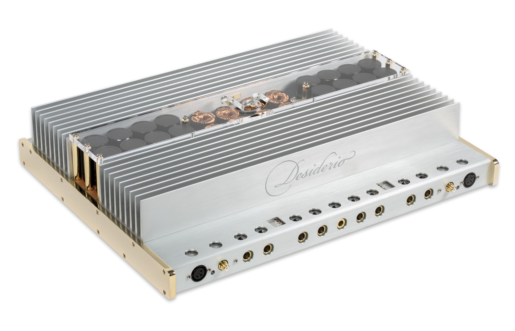 Desiderio е флагманът на Quartorigo, безкомпромисно художествено произведение, създадено за истински аудиофили. Но също така и здраво чудовище с огромна мощ, тегло над 18 Kg и внушителни размери. Въпреки това притежава лекота и елегантност благодарение на плавните извивки на алуминиевото шаси в комбинация с медни акценти. Предната част на усилвателя доминира елегантната гравюра Desiderio, издълбана в могъщия радиатор. Пред нея са масивните говорителни и захранващи терминали, обработени от медни блокове и финално позлатени с 24-каратово злато. Там също ще намерите висококачествени ембосирани RCA конектори, направени от същите материали. Отгоре, през дебело плексигласово стъкло, можете да надникнете в сърцето на това майсторско парче, което разкрива своите надразмерени кондензатори и транзистори. Истинско преживяване не само за вашите уши, но и за очите.