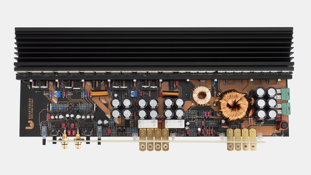Ако погледнем във вътрешността на усилвателя, ни очаква истинско удоволствие. Прецизната изработка и изключителните компоненти са основата за бъдещия успех на тези усилватели. Основният градивен елемент е двустранната печатна платка с оптимизирани трасета, които осигуряват отлична стабилност и електрическа и механична издръжливост. Всички мощни транзистори са подредени от едната страна на основната платка, където са свързани към радиатора чрез алуминиева шина и по този начин са електрически изолирани от него. Тороидните трансформатори са предимензиирани и конструирани с многократно навиване. Тримерите, разположени на входния сигнал, са свързани един след друг и също така по пътя на сигнала не е използван електролитен кондензатор. За да се предотврати пукане в говорителите, се използват висококачествени релета за разкачане на аудио сигнала при включване и изключване. Ембосирани RCA конектори значително подобряват стабилността на връзката със сигналните кабели, дори при взискателни условия по време на по-агресивно шофиране.