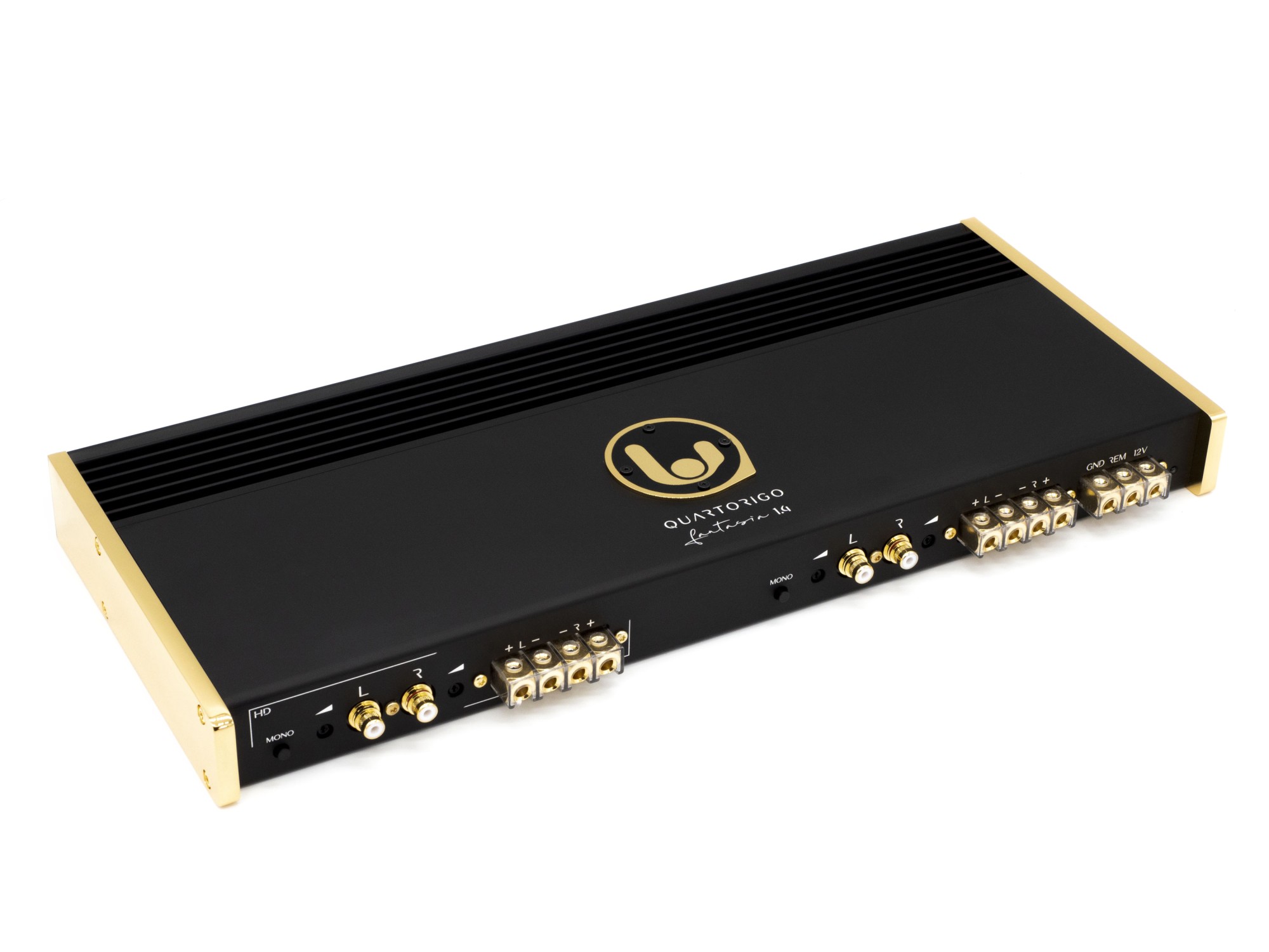 В сравнение с другите усилватели Quartorigo, Fantasia може да изглежда почти консервативна. Дизайнът ѝ обаче продължава линията на тридесетгодишния предшественик, на когото Fantasia отдава почит чрез своето възраждане. Гладки тънки извивки, елегантна простота и луксозна черно-златна цветова комбинация – това е истинският италиански дизайн в цялата си красота. Четири модела висококласни усилватели, от които всеки може да избере най-подходящия за изискващи sound quality инсталации. Усилвателите Fantasia заместват изключително успешните модели Heritage и Precision и съчетават различните им концепции на клас A и AB в една продуктова линия. Във всички важни параметри, и особено в звука, те надминават предшествениците си. Предлагат се три двуканални и един четириканален модел, който е истинска рядкост. Неговите два канала са в клас A, а двата други в клас AB, което представлява идеална комбинация за високочестотни и средночестотни, или среднобасови говорители. Както при повечето усилватели Quartorigo, всички свързващи конектори са на предната страна на усилвателя, включително управление на gain. Не търсете други контроли, които биха могли да навредят на крайния звук. Повечето усилватели Fantasia имат бутон Mono, при натискане на който работи само левият gain и RCA конектор. Някои усилватели разполагат и с бутон за превключване на фаза.
