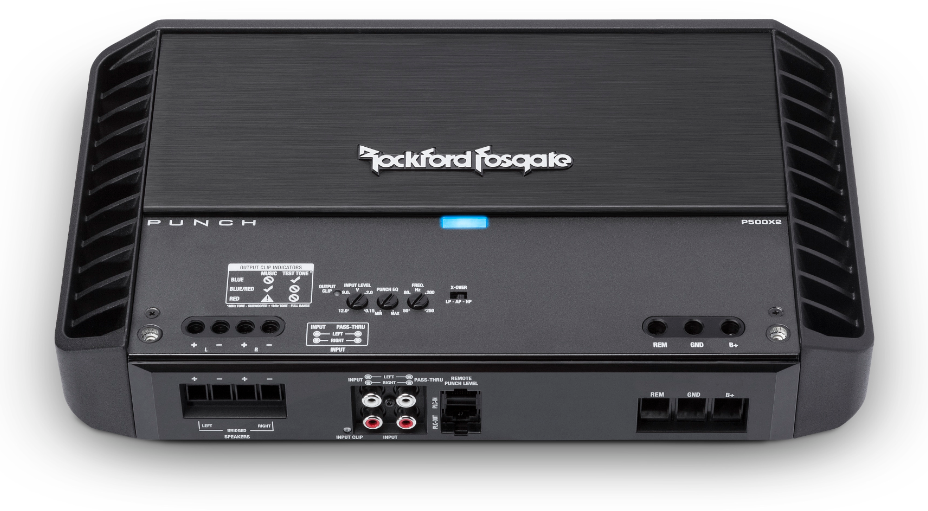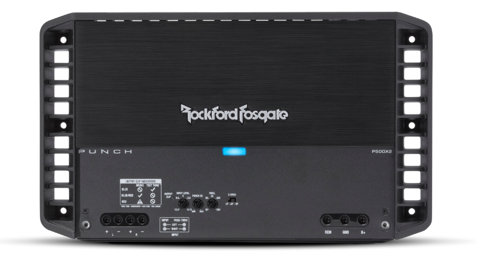 Усилвателят P500X2 от серията Punch предлага уникална възможност да изведете вашата аудио система на напълно ново ниво, без да запълвате целия багажник - така ще имате повече място за субуфери! Поради екстремната изходна мощност този усилвател е най-подходящ за работа с два 8Ω SVC субуфера или четири 2Ω DVC субуфера. Независимо коя конфигурация изберете, винаги трябва да инсталирате подходящи сечения на захранващите и сигналните кабели.