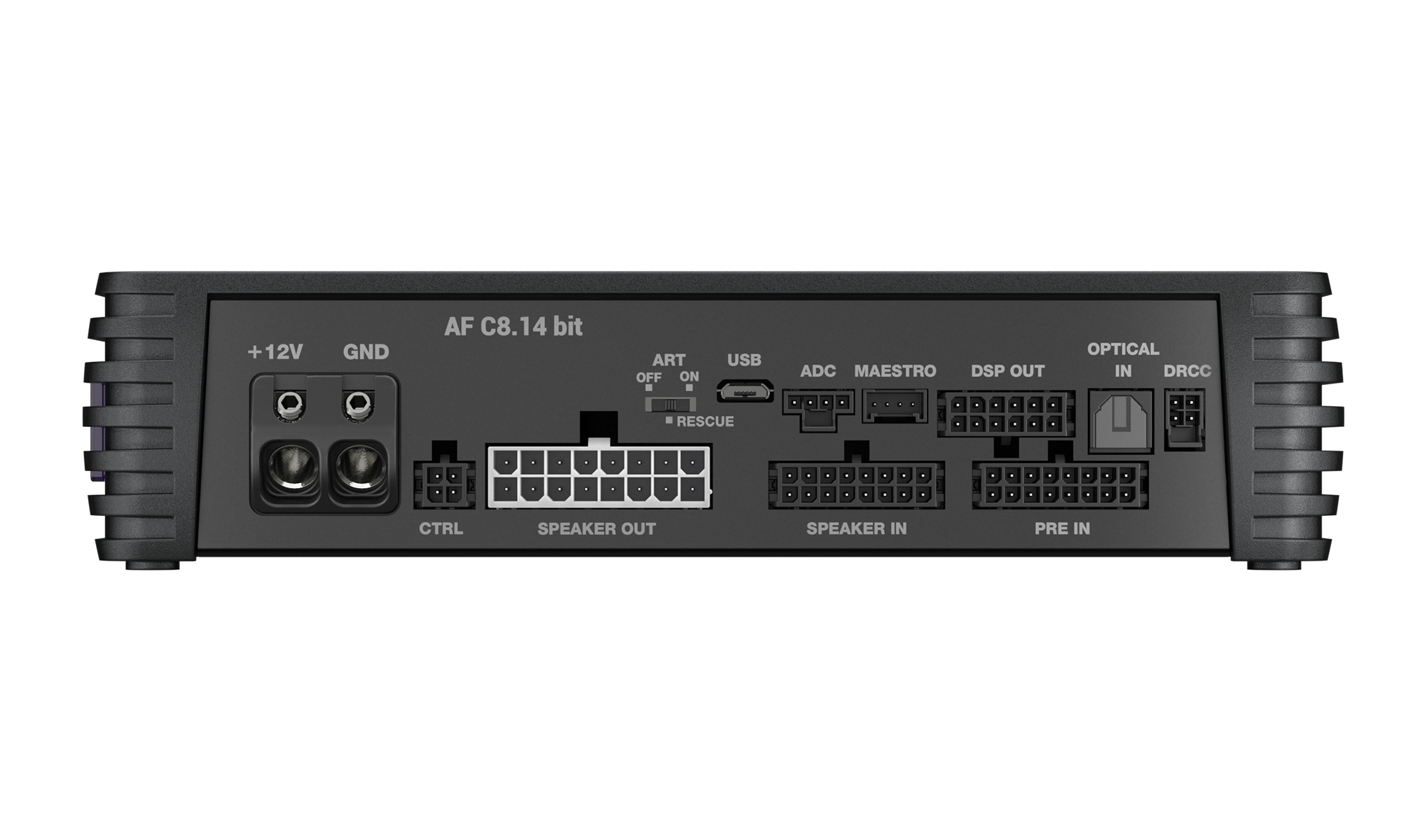Audison AF C8.14 bit от най-новото поколение усилватели Forza от 2022 г. се гордее с осем високо достоверни усилени канала 65 W x 8 на 4 Ω, 100 W x 8 на 2 Ω с аудиофилски звук благодарение на най-новото поколение технология Audison D-Class. По-висока превключвателна честота, по-строго филтриране и компоненти с по-висока толерантност предоставят звук отвъд очакванията за клас D – в удивително компактен пакет! Това е комбинирано с нативен DSP, работещ на 24 bit/96 kHz, разширяващ звуковия диапазон до 40 kHz и постигащ желаната сертификация High-Resolution. Усилвателят може да бъде и мостово свързван, което позволява гъвкав и мощен изход. Поддръжката на функцията Absolute Volume Audison B-CON гарантира максимална дълбочина на битовете, дори при безжично свързване.Нов софтуер за настройка на DSP