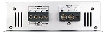 | Брой каналиУсилвателите се разделят на: - моноблокове - 2-канални - 3-канални - 4-канални - 5-канални - 6-канални - многоканални Всеки канал служи за захранване на един високоговорител при коаксиален тип или на една страна, ако става въпрос за компонентни високоговорители. Усилвателите от тип моноблок се използват предимно за субуфери. 2-каналните са подходящи както за субуфери, така и например за преден чифт високоговорители в автомобила. 3-каналните се използват за предни или задни високоговорители + субуфер. 4-каналните се използват за предни + задни високоговорители или 1 чифт високоговорители + субуфер. 5- или 6-каналните обикновено се използват за 2 чифта високоговорители + субуфер. Бриджиране означава свързване на усилвателя в мост, когато се използва + полюс от един канал и - полюс от другия канал. В повечето случаи това е означено на усилвателя като "BRIDGED". | моноблок |