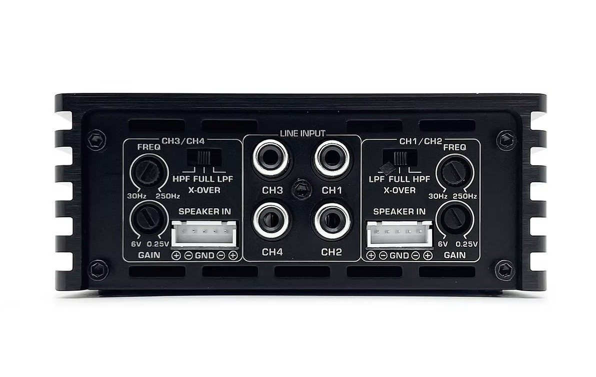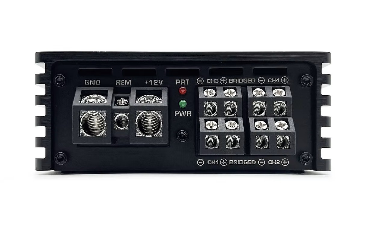 - Мощност: 4 × 100 W RMS @ 4 Ω / 2 × 250 W RMS в мостов режим.