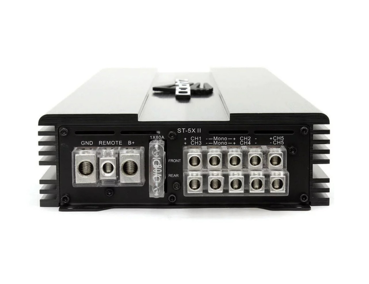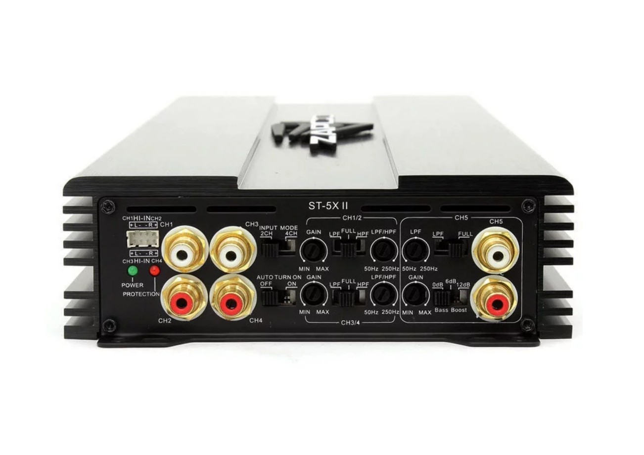 Сериите усилватели Studio-X на Zapco са проектирани специално за съвременния автомобилен аудио пазар. Компактното шаси Studio-X позволява лесен монтаж във всяко превозно средство и благодарение на модерния ъглов дизайн в черен цвят усилвателите изглеждат отлично във всяка инсталация. Zapco ST-5X е универсален all-in-one усилвател от продуктовата линия Studio-X с мощност 100 W RMS на канал и допълнителен пети канал за субуфер с мощност 200 W RMS при 4 ома. Това е истинска електроцентрала в компактно шаси. Както и другите усилватели ST-X, ST-5X е клас A/B, дори и на басовия канал, така че получавате точни и силни баси. Този усилвател може да се мостира и да доставя по-висока мощност при работа на 2 Ω. Усилвателят се справя лесно със своите 300 W RMS за субуфер при 2 ома, дори с мощни преобразуватели. ST-5X има превключвател на входния режим, така че можете да използвате всичките шест входни канала, или само четири или два канала. Ако имате само стерео главно устройство, е възможно лесно да управлявате предни и задни говорители и субуфер.