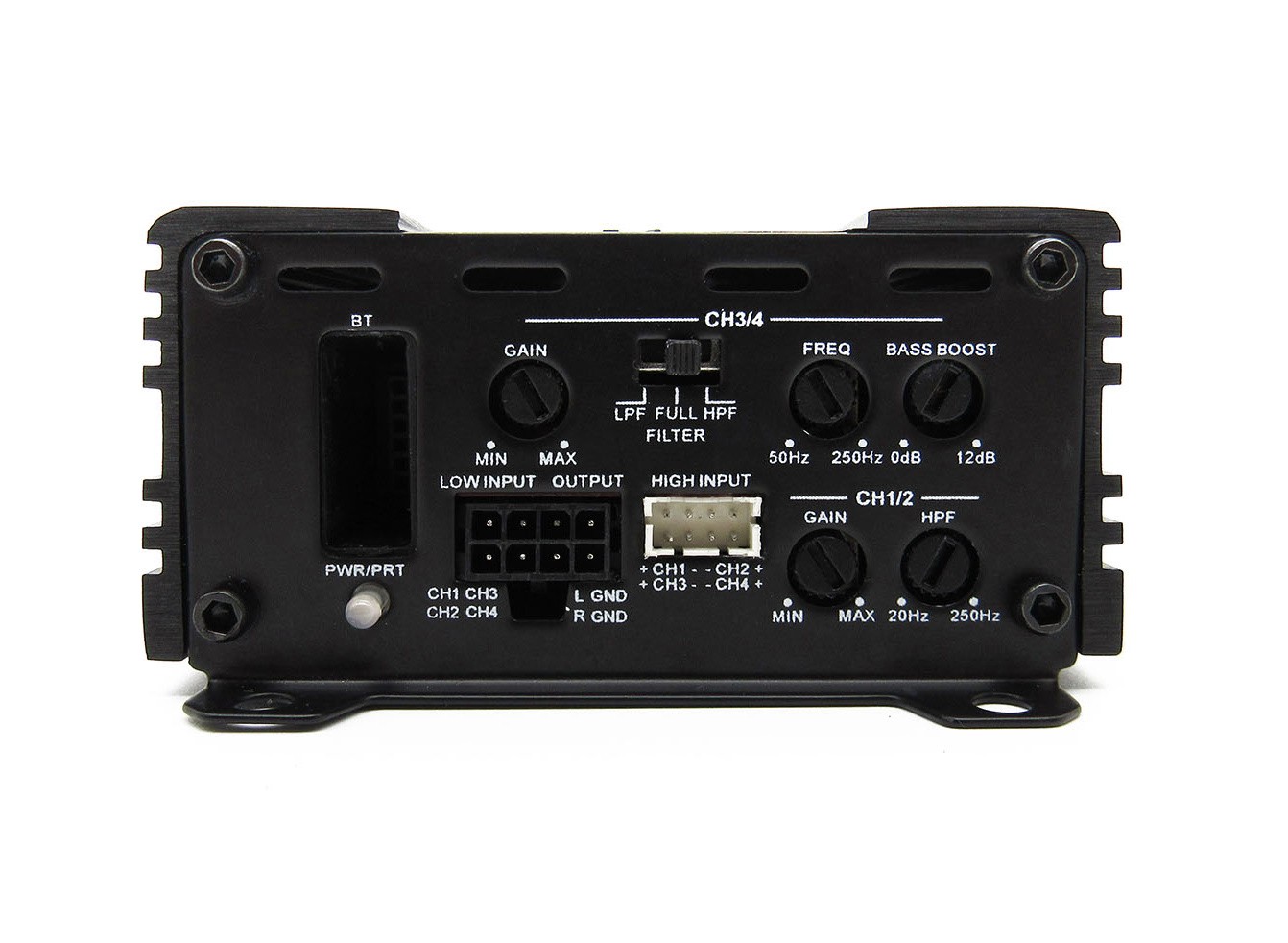 | Филтър за високи честоти (HPF)HPF / HP или "hi pass filter" предлага възможност за настройка на усилвателя чрез потенциометър така, че средните, евентуално среднобасовите и високите честоти да възпроизвеждат от определена честота нагоре. Пример: Усилвателите най-често имат HPF от 40 до 300 Hz. Ако настроим на потенциометъра стойност ок. 150 Hz, звукът ще бъде отсечен така, че ще възпроизвежда честоти от 150 Hz до максималната горна граница на целия честотен обхват на усилвателя, примерно до 20.000 Hz. Препоръчваме да настройвате този потенциометър в диапазона 80-160 Hz. Благодарение на тази възможност за настройка, високоговорителите понасят по-голяма мощност, тъй като няма да ги претоварвате с баси в долния честотен диапазон. | 20 - 250 Hz |