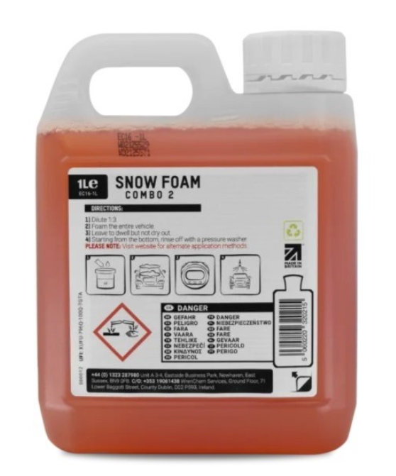 ValetPRO Snow Foam Combo 2 е високо пенлива, алкална активна почистваща пяна. Въпреки това не е щадяща към восъците, затова е подходяща за използване на автомобили, които не са навосквани. Това е силен почистващ препарат, който отлично отстранява повечето замърсявания, но също така може да премахне и естествения восък. При използване с накрайник за гъста пяна създава плътен слой „снежна“ пяна, който увеличава времето на контакт с повърхността на автомобила, докато прониква в мръсотията. Тази алкална пяна е идеална и за отстраняване на петна от масло, бензин и дизел. Също така помага да се премахне восъчният слой, така че може да се използва за пълна деконтаминация на автомобила преди полиране или ново восъчене. Тази активна пяна предлага отлична производителност на добра цена.