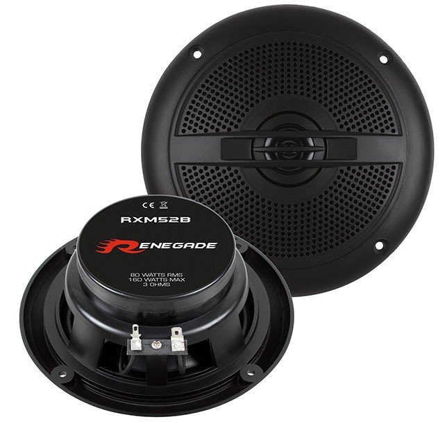 Влагоустойчиви високоговорители Renegade RXM, които предлагат при ниска цена високо качество на звука, здрава изработка и дълготрайност благодарение на солидната конструкция. Говорителите Renegade RXM са подходящи за монтаж на лодки, в бани, в тоалетни на ресторанти, на външни тераси, в градински ресторанти, беседки и др. Те са устойчиви на пръски вода и поради тази причина имат кош от втвърдена пластмаса (цвят на коша е елегантно черен - неутрален и ненатрапчив). Вграденият високочестотен говорител с майларова мембрана има диаметър 25 мм. В опаковката ще намерите 2 броя говорители.Основни характеристики