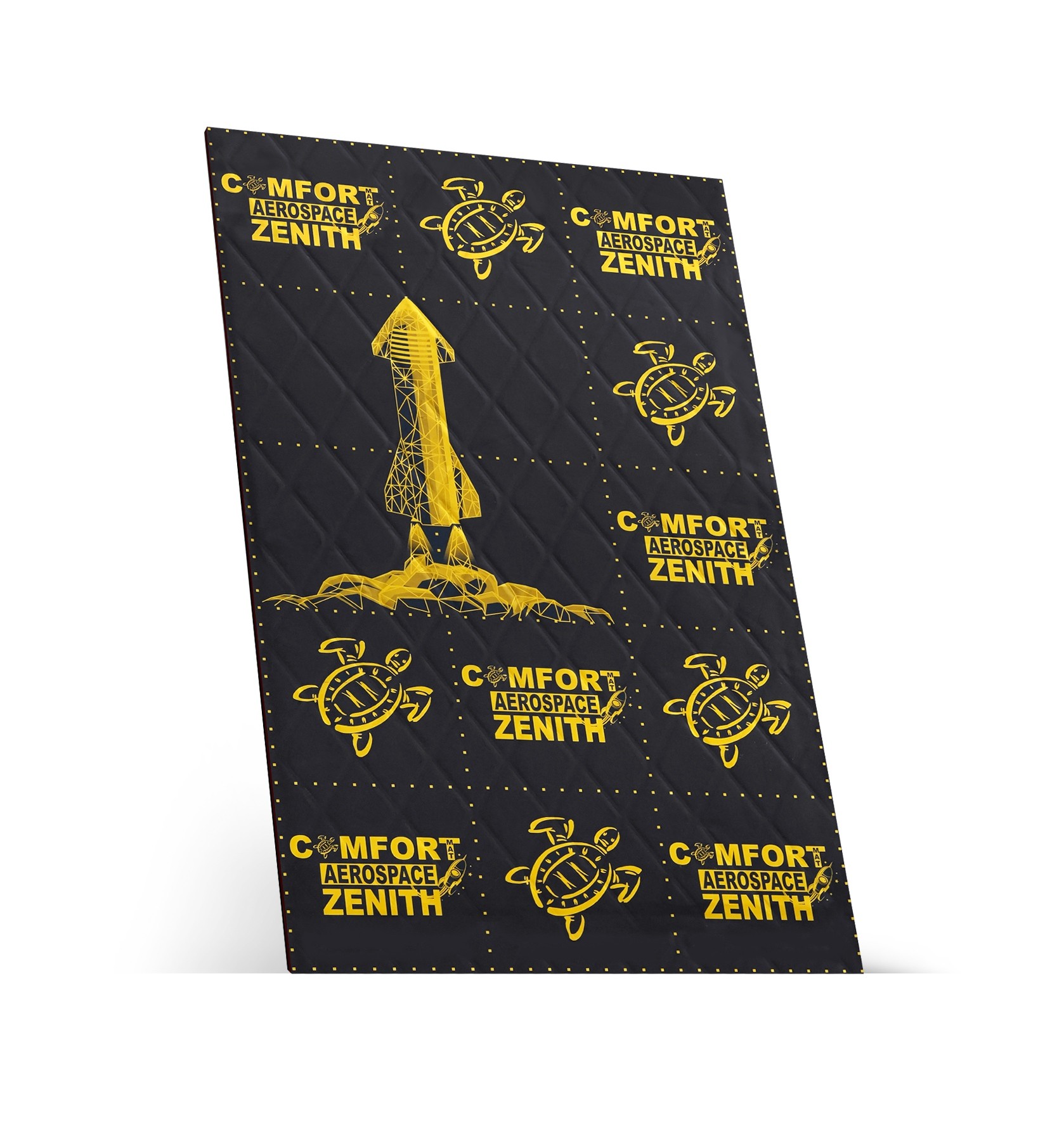 Comfortmat Zenith е най-ефективният материал от серията виброакустични продукти Aerospace, който в един слой съчетава напреднали анти-вибрационни и звукоизолационни свойства. Благодарение на здрава многослойна конструкция, оптимизирана за максимално поглъщане на вибрациите и шума, Zenith е предназначен за най-натоварените участъци от каросерията на автомобили, където целта е да се постигне върхов комфорт по отношение на акустиката без компромиси. Обща дебелина 9 mm, включително 3 mm тежка звукоизолационна мембрана, позволява ефективно поглъщане на вибрациите и същевременно значително ограничава пропускането на въздушен шум. Материалът постига акустичен загубен коефициент (MLF) до 0,62, което превъзхожда повечето конвенционални анти-вибрационни материали. Освен това е оборудван с твърда алуминиева фолио Scale One с дебелина 100 микрона, която осигурява размерна стабилност, устойчивост на механични повреди и увеличава предаването на гасещата енергия в конструкцията на превозното средство. Zenith намира приложение основно на пода, в зоната на калниците, при преградата на моторния отсек, централния тунел или в задната част на автомобила, където е необходим значителен шумопоглъщащ ефект в една единствена апликация. Резултатът е изключително висока ефективност при запазване на разумна площова маса, не надвишаваща 9 kg/m². Това представлява средна икономия на маса от 35–40 % в сравнение с обичайните двуслойни приложения, което е особено важно при шумоизолация на електромобили, спортни автомобили и навсякъде, където ниското тегло на използваните материали е приоритет.