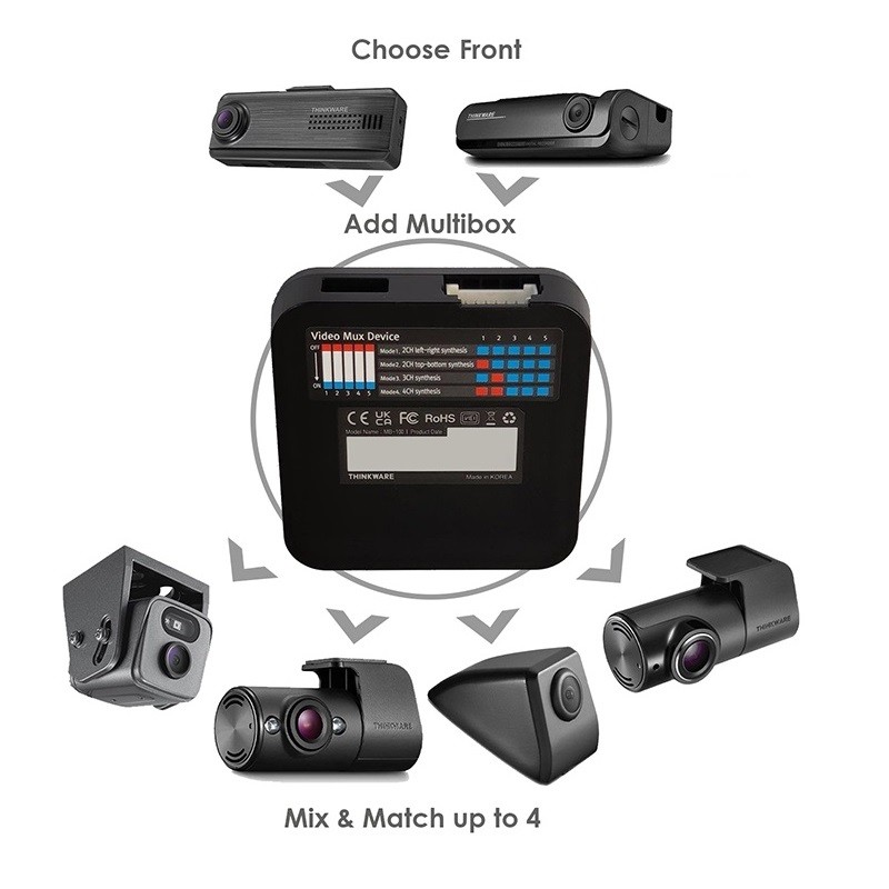 Thinkware MB100 е практичен видео сплитер модул, който разширява възможностите на съвместимите автокамери за свързване на допълнителни камери. Модулът позволява да се свържат към главната камера Thinkware F200PRO или T700 до четири допълнителни камери, така че крайният системен набор може да работи с общо до пет обектива. Това осигурява значително по-добър преглед върху случващото се в автомобила и около него и увеличава полезността на камерната система както при шофиране, така и при паркиране.
