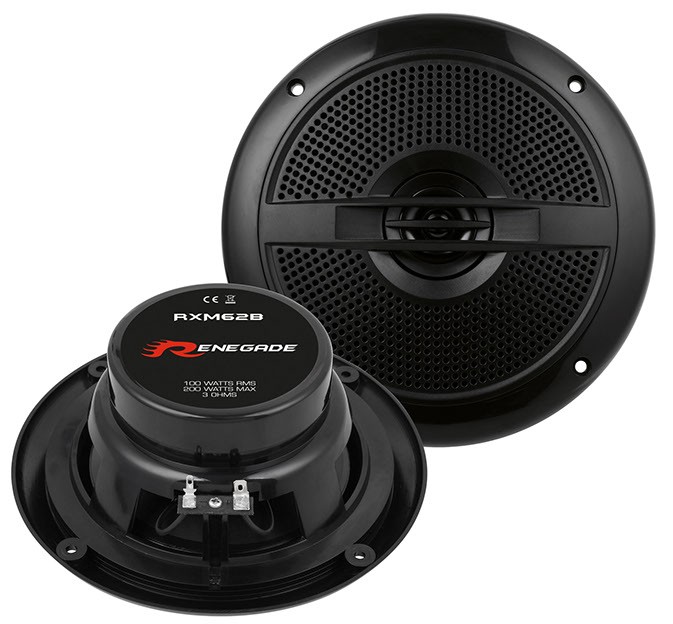 Влагозащитни говорители Renegade RXM, които предлагат при ниска цена високо качество на звука, здрава изработка и дълготрайност благодарение на солидната конструкция. Говорителите Renegade RXM са подходящи за използване на лодки, в бани, в тоалетни на ресторанти, на външни тераси, в градински ресторанти, беседки и т.н. Те са устойчиви на пръски вода и поради тази причина кошът е от втвърден пластмасов материал (цветът на коша е елегантно черен - неутрален и ненатрапчив). Вграден високочестотен говорител с mylar мембрана има диаметър 25 мм. В комплекта ще намерите 2 броя говорители.Основни характеристики