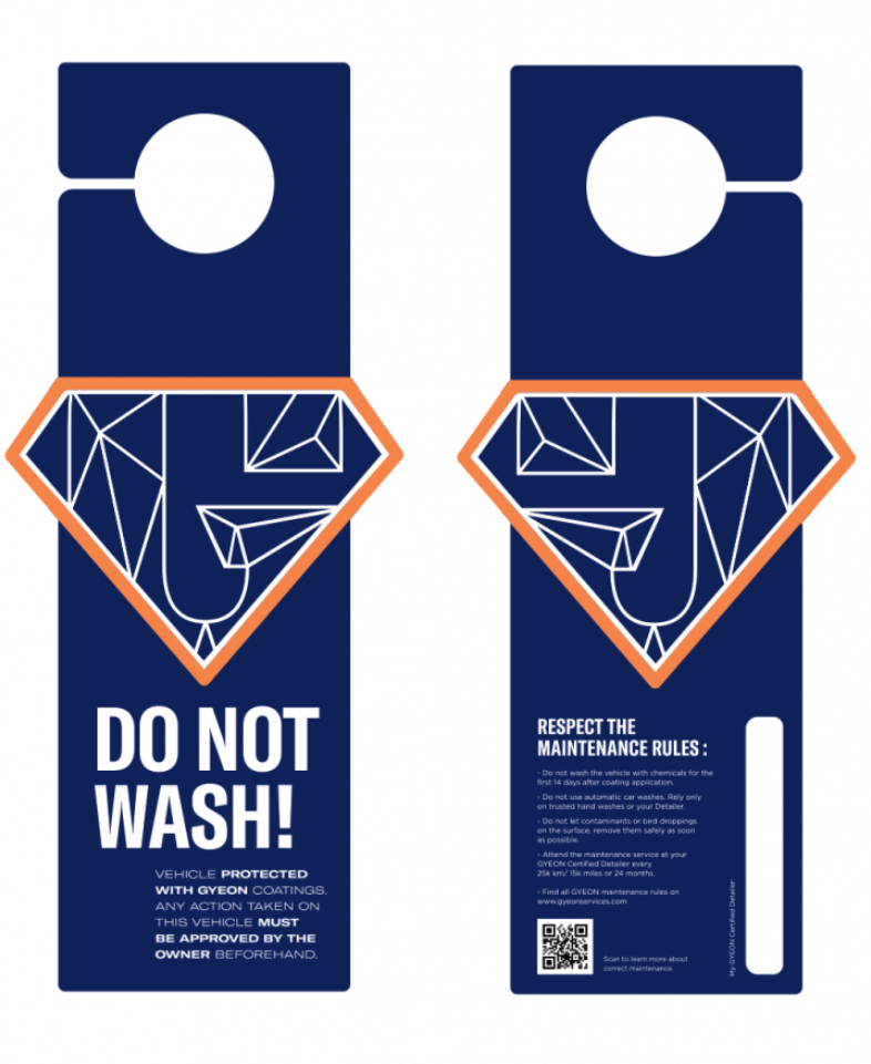Висящото предупреждение е подходящ помощник за професионалните детайлъри, които вършат своята професия изключително старателно и искат да са сигурни, че дори клиентът няма да пренебрегне или повреди нещо. Тази табелка предупреждава клиента да не мие автомобила в момента, например ако върху автомобила е току-що нанесено керамично защитно покритие на лака и т.н.