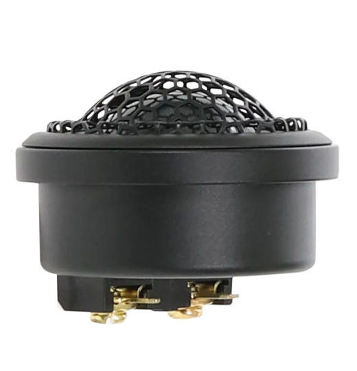 | Тип на високоговорителитеКоаксиални високоговорители: Коаксиалните високоговорители се характеризират с конструкция, наречена всичко в едно. Високочестотният и среднобасовият говорител са в един и същ кош. Предимството е по-лесен монтаж, но поради свързването или близостта на честотните диапазони в един говорител обикновено се понижава качеството на звука. Обикновено в центъра на среднобасовия говорител се намира високочестотният говорител, чиито звукова бобина работи във втората въздушна междина на общия магнитен кръг. Коаксиален говорител с три честотни диапазона се състои от среднобасов говорител, отпред на специален носач е поставен средночестотният говорител и отделен високочестотен. Компонентни високоговорители: Компонентните високоговорители се отличават с разделянето на отделни честотни диапазони: високочестотен + среднобасов + евентуално басов диапазон. Отделните говорители могат да бъдат разположени напълно отделно, което води до по-добро звуково и акустично представяне. В огромното мнозинство от случаите при компонентните високоговорители се доставя и външна кросоувърна мрежа, която разделя високите, средните/среднобасовите и при системи с три честотни диапазона и басовите честоти, както и позволява настройване на нивото в децибели на високочестотния говорител (напр. +2 dB, 0 dB, -2 dB), стръмността (напр. 6 dB/октава, 12 dB/октава) или активно/bi-amp свързване. | Високочестотни |