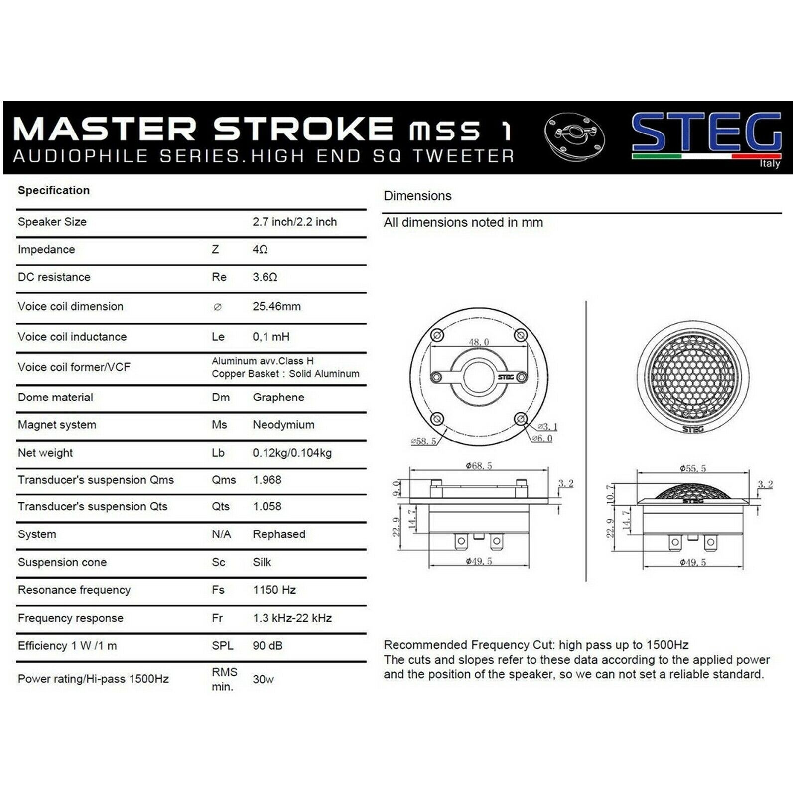 Най-съвременната система, проектирана и произведена без компромиси. Кошът на високочестотните говорители MSS е фрезован от твърд алуминиев блок, което позволява да изпитате звук без резонанси. "Никакви компромиси!" - казаха в Италия и тестваха говорителите на най-добрите симулатори при изключително високо натоварване. Те могат да впечатлят слушателя с качество на звука, прецизност и импулсна реакция, благодарение на тяхната изключително ниска резонансна честота.| Каталожен номер | MSS 1 |