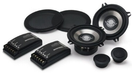 | Тип на високоговорителитеКоаксиални високоговорители: Коаксиалните високоговорители се характеризират с конструкция, наречена всичко в едно. Високочестотният и среднобасовият говорител са в един и същ кош. Предимството е по-лесен монтаж, но поради свързването или близостта на честотните диапазони в един говорител обикновено се понижава качеството на звука. Обикновено в центъра на среднобасовия говорител се намира високочестотният говорител, чиито звукова бобина работи във втората въздушна междина на общия магнитен кръг. Коаксиален говорител с три честотни диапазона се състои от среднобасов говорител, отпред на специален носач е поставен средночестотният говорител и отделен високочестотен. Компонентни високоговорители: Компонентните високоговорители се отличават с разделянето на отделни честотни диапазони: високочестотен + среднобасов + евентуално басов диапазон. Отделните говорители могат да бъдат разположени напълно отделно, което води до по-добро звуково и акустично представяне. В огромното мнозинство от случаите при компонентните високоговорители се доставя и външна кросоувърна мрежа, която разделя високите, средните/среднобасовите и при системи с три честотни диапазона и басовите честоти, както и позволява настройване на нивото в децибели на високочестотния говорител (напр. +2 dB, 0 dB, -2 dB), стръмността (напр. 6 dB/октава, 12 dB/октава) или активно/bi-amp свързване. | компонентни 2-посочни |